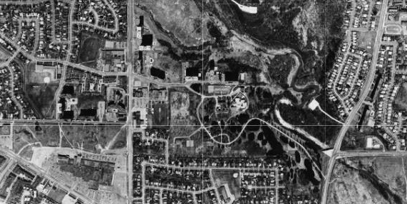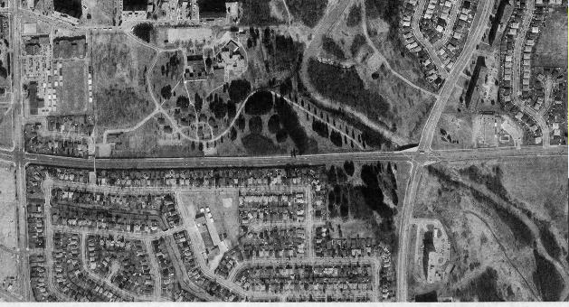 Old Eglinton Road as seen in this 1971 aerial photo. The road can be seen cutting through the trees in the lower right hand corner. The new Eglinton Ave is marked where it runs a couple hundred meters north of the old road.