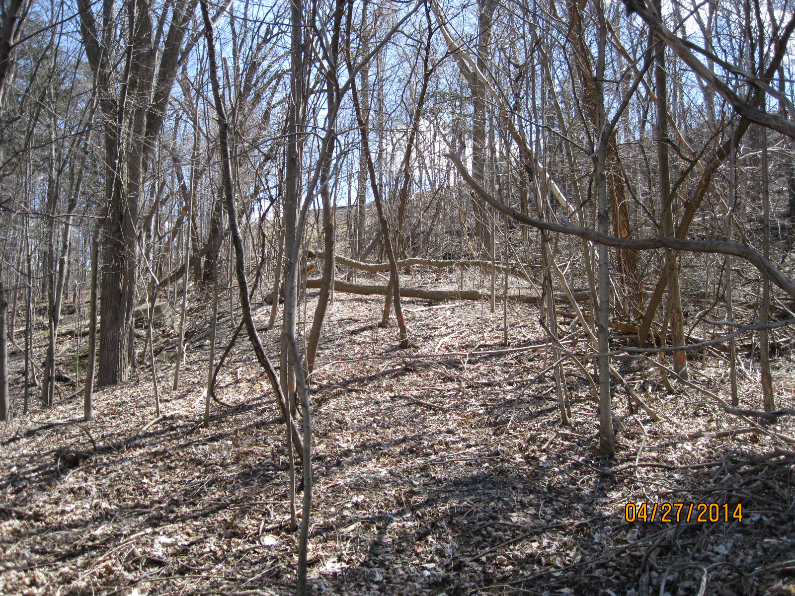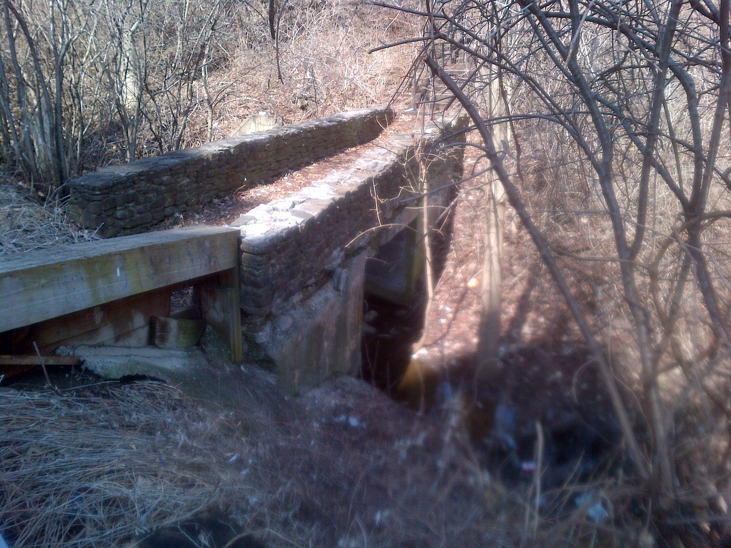 Hiding in the trees and leading straight up the hill into the side of a building are five concrete supports for a bridge. As of this writing I can’t find anything on them.