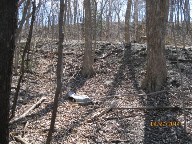 After skirting the edge of the hill for a short while you will come across a ramp coming down the hillside. This is the end of Old Eglinton Road when it used to come down the hill and out to the railroad tracks as recently as the 1970’s. There is some garbage along the north side of the roadway but nothing to specifically date the rubbish. Lots of Ketchup bottles but unfortunately Heinz never took to dating their bottles.