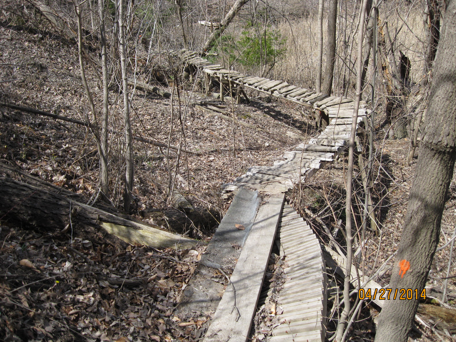 Following the trail a little further brings you to a small stream that disappears under the railroad tracks and runs under the golf course to the East Don River. If you take the trail away from the tracks and midway along the side of the hill you will come to a place to cross the stream where it flows out of a large culvert. Crossing the culvert and turning to your right you will find a set of five footings from an old bridge. The footings on the north side have been broken up, but still remain. I disturbed a pair of cardinals who likely have a nest here. As usual they’re a little camera shy and don’t sit still long enough to get their picture taken.