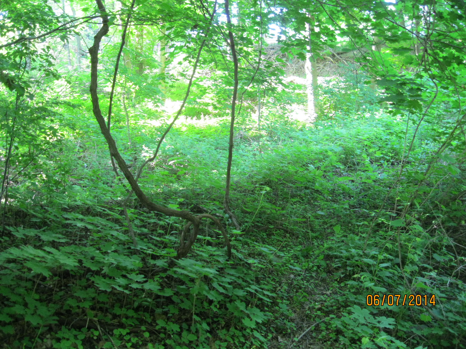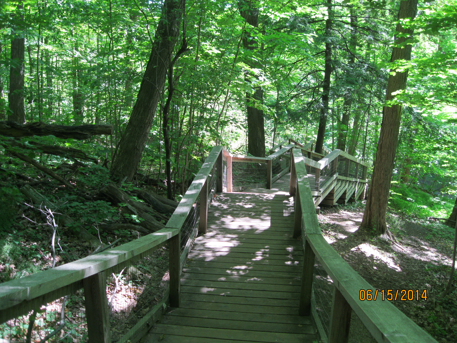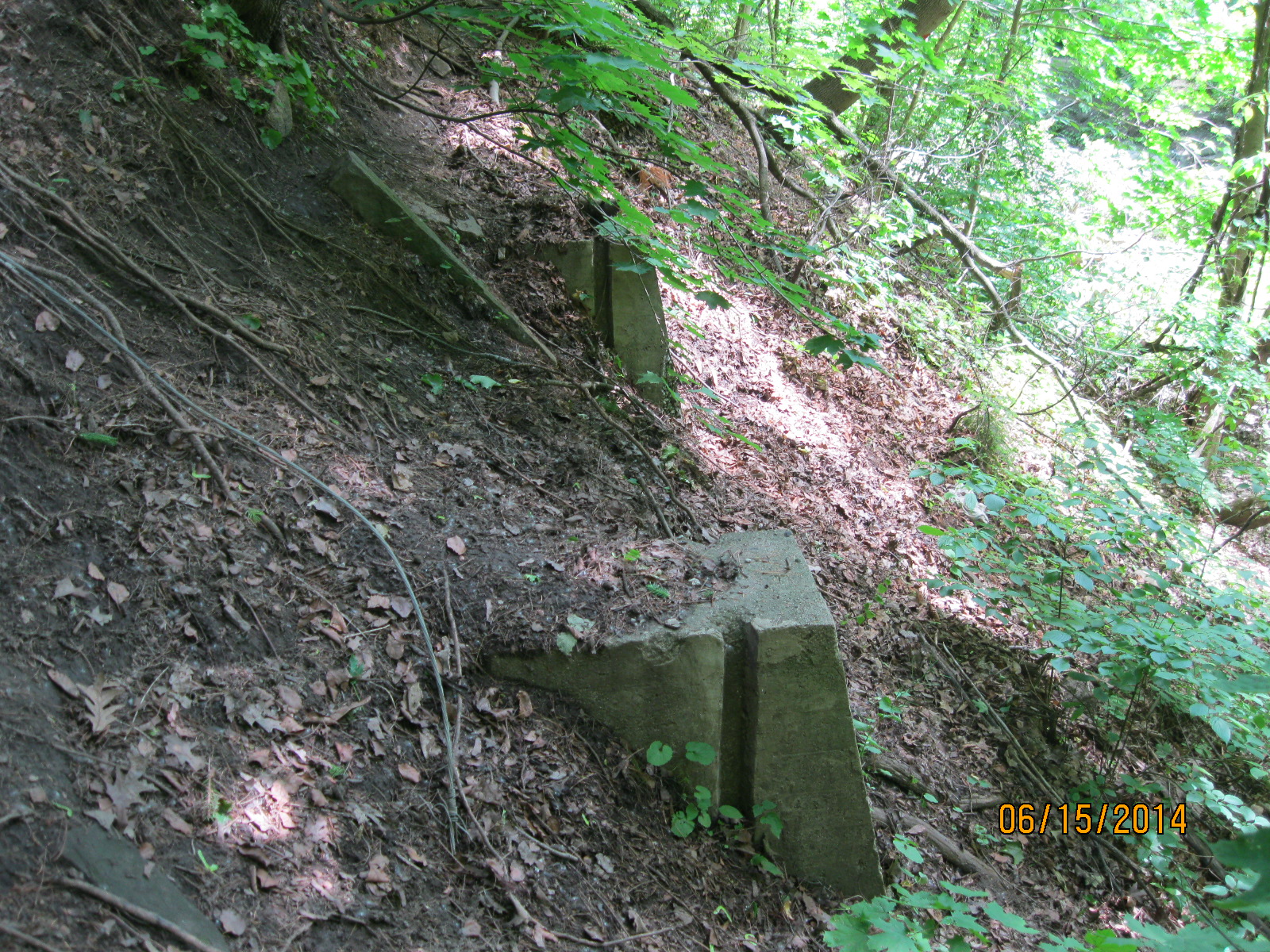 If you return to the main trail near the pine trees that mark the old lane way you can make your way further north in the park. Soon you will come to this old set of stone stairs. Even with some missing, there is still over 100 steps on the hill side. These will take you back up to the back yard of Riverwood.