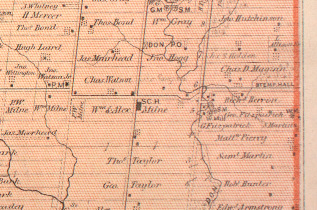 In 1833 Peter McDougall acquired 200 acres of land as a crown grant. The property changed owners a few times until 150 acres of it was purchased in 1913 by W. R. Percy and Ida Parker. In 1914 they built a stone cottage on the top of the hill and used it in the summer to get away from their home in Toronto. The lane way leads up the side of the ravine to the cottage.