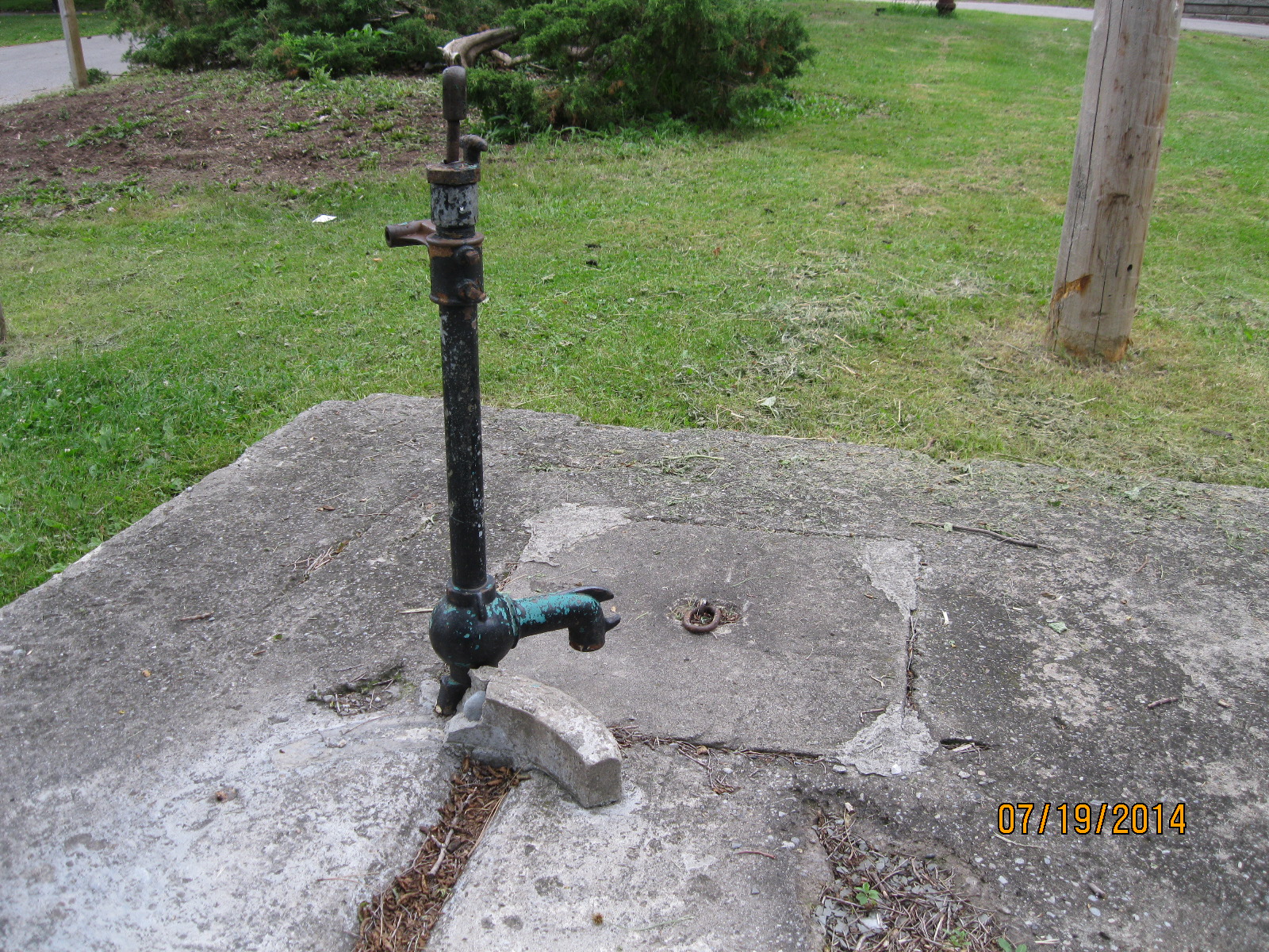 Early wells in Ontario were dug by hand and had to be large enough to allow a man to swing a pick axe.  They were dug in depths up to 30 meters or more.  Early wells had a hand crank which wound or unwound a rope that lowered a bucket into the well.  The invention of hand pumps allowed for easier access to water but were limited in the depth of their draw to about 15 meters.  The old well and pump still exists at the front of the house.