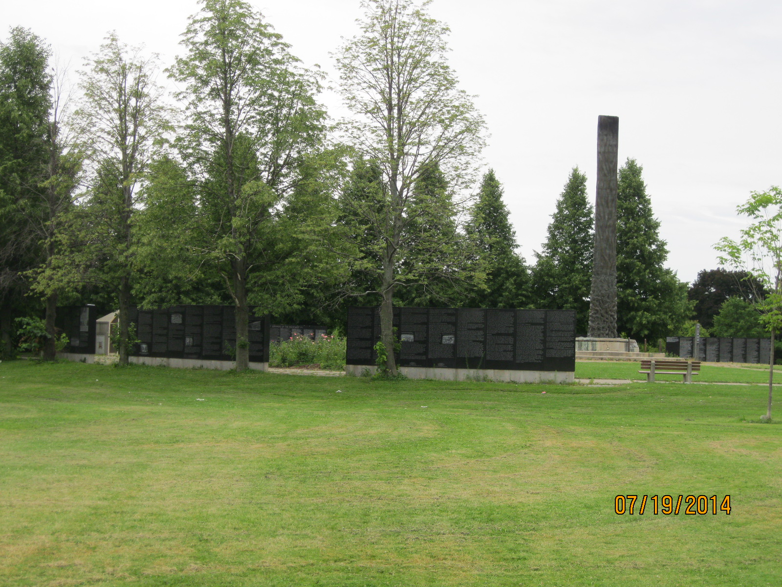 The park sits on land that used to be The York Downs Golf and Country Club and the land forms still show.  Just south of the house is a memorial to the Holocaust.  The memorial includes a chimney on the right which has the names of various death camps on it.  The black wall to the left of that contains the story of the holocaust on one side and 23 panels of names of victims and their country on the other.  This is certainly the most somber place we’ve come across while hiking.