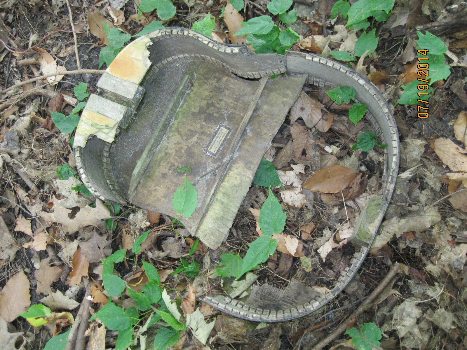 We went back down the hill towards the river.  There is an area where some stuff has been thrown down the hill.  Amongst it we found this old guitar.  It was sold by Eglinton Music Centre which still exists today.  It made me think of a song by Jethro Tull called Songs From The Wood.