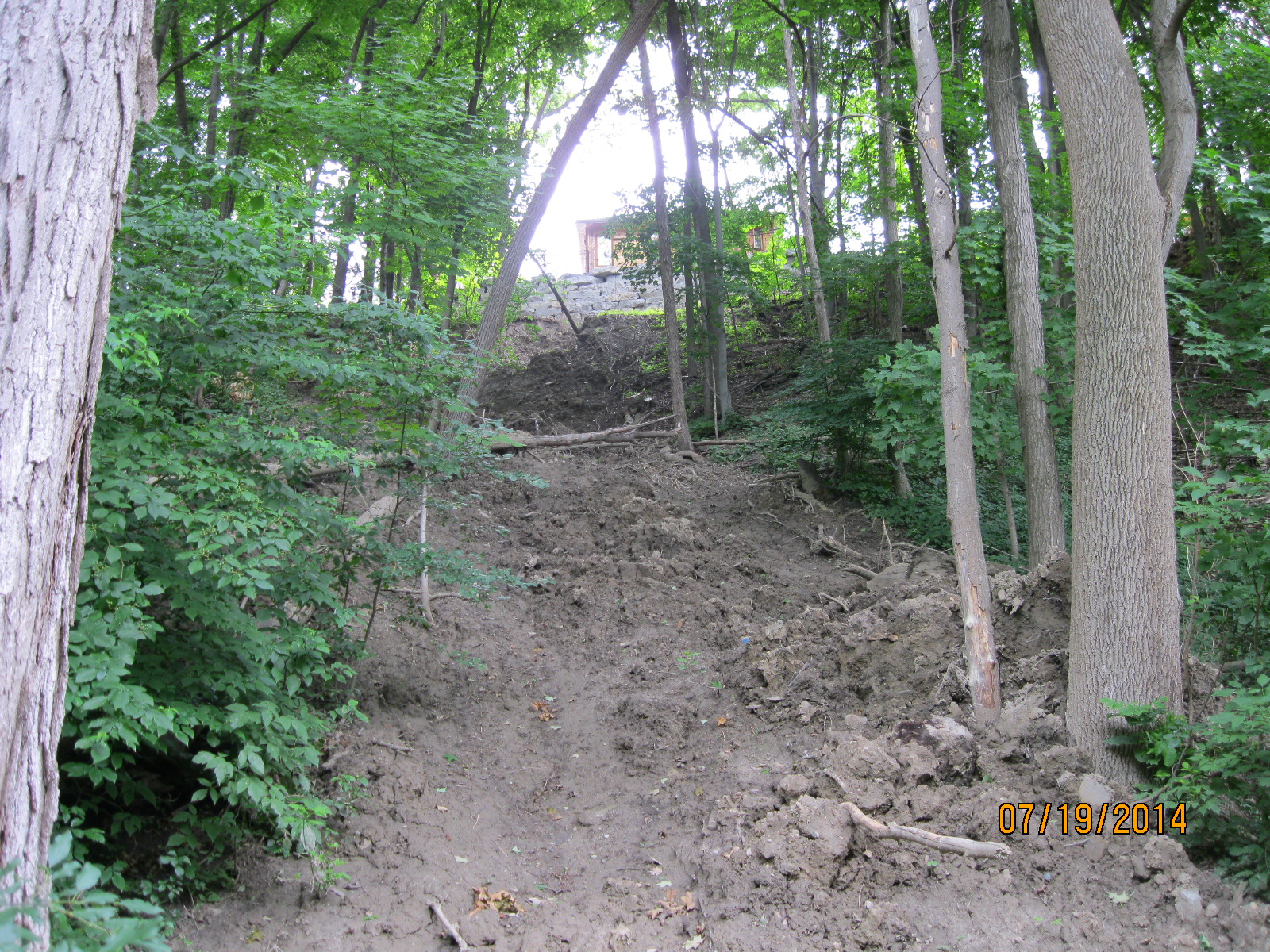 We walked back past the car and crossed the 1962 bridge to get to the path that leads down the east side.  We took a few minutes to have a look just north of the 401 and here we found a place where a large mudslide has ripped away part of the hill.  In all my years of hiking this is the first time I have seen this.