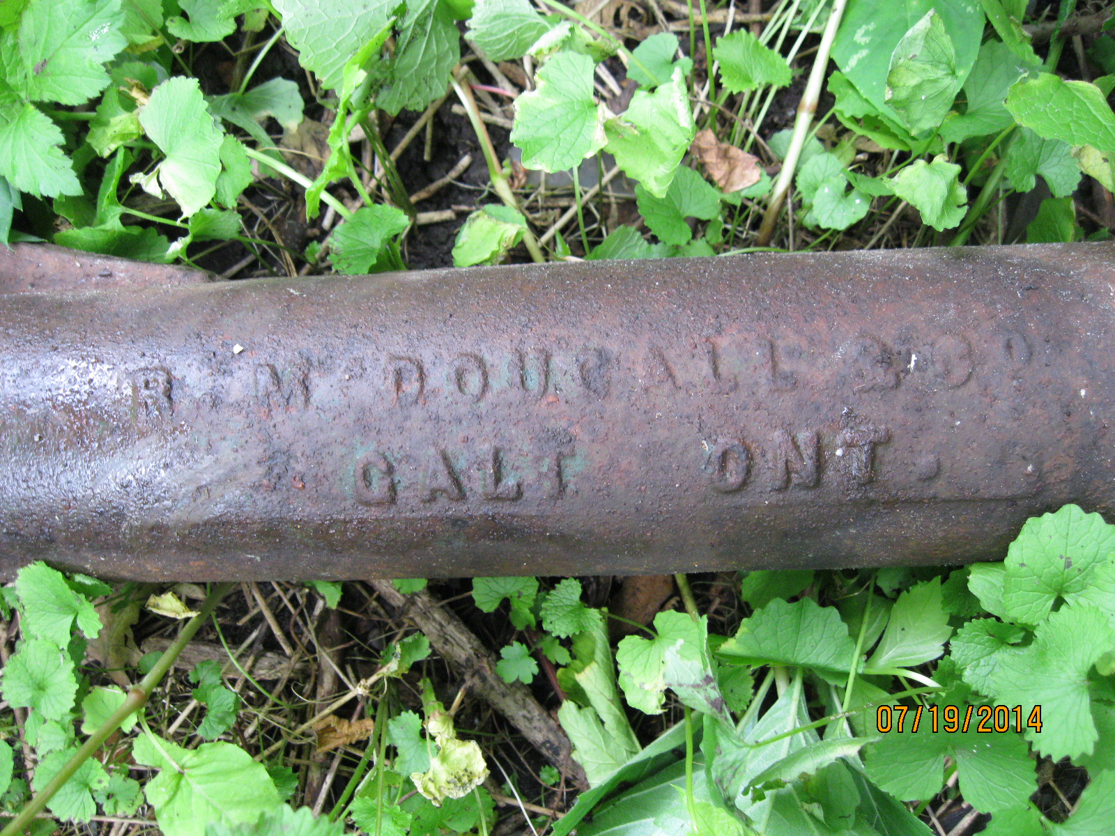 R. McDougall & Co. in Galt was a manufacturer of heavy steel equipment from the late 1880’s until they were bought out in 1951.  They specialized in lathes, but apparently also made water pumps.  The one we found here was dated 1921.