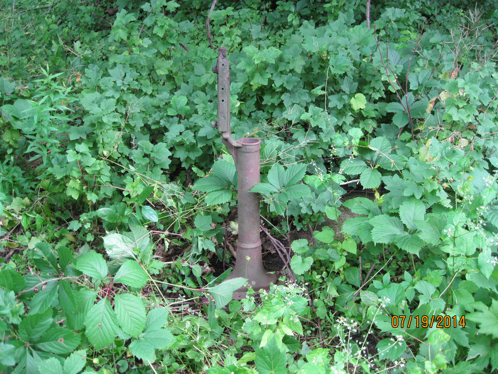 An area without larger trees at the bottom of the hill suggests the need for investigation. The foundations of a building lie here.  Another hand pump was found inside the foundation.