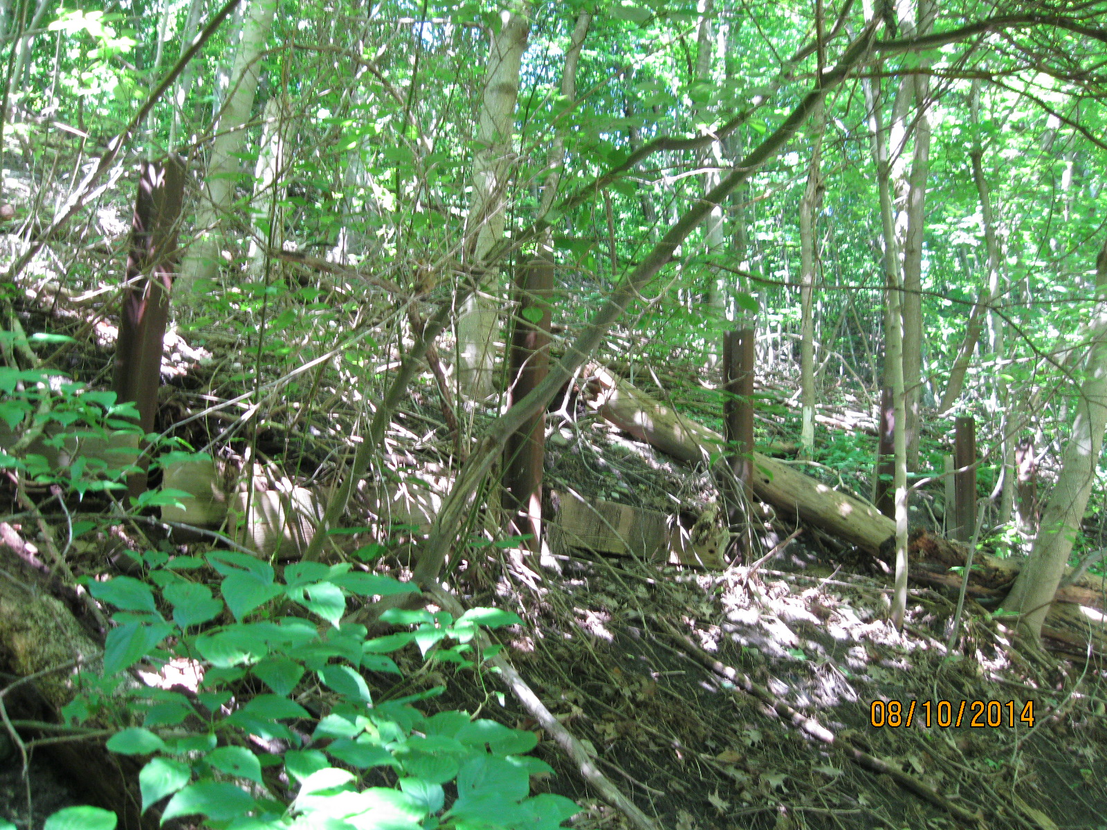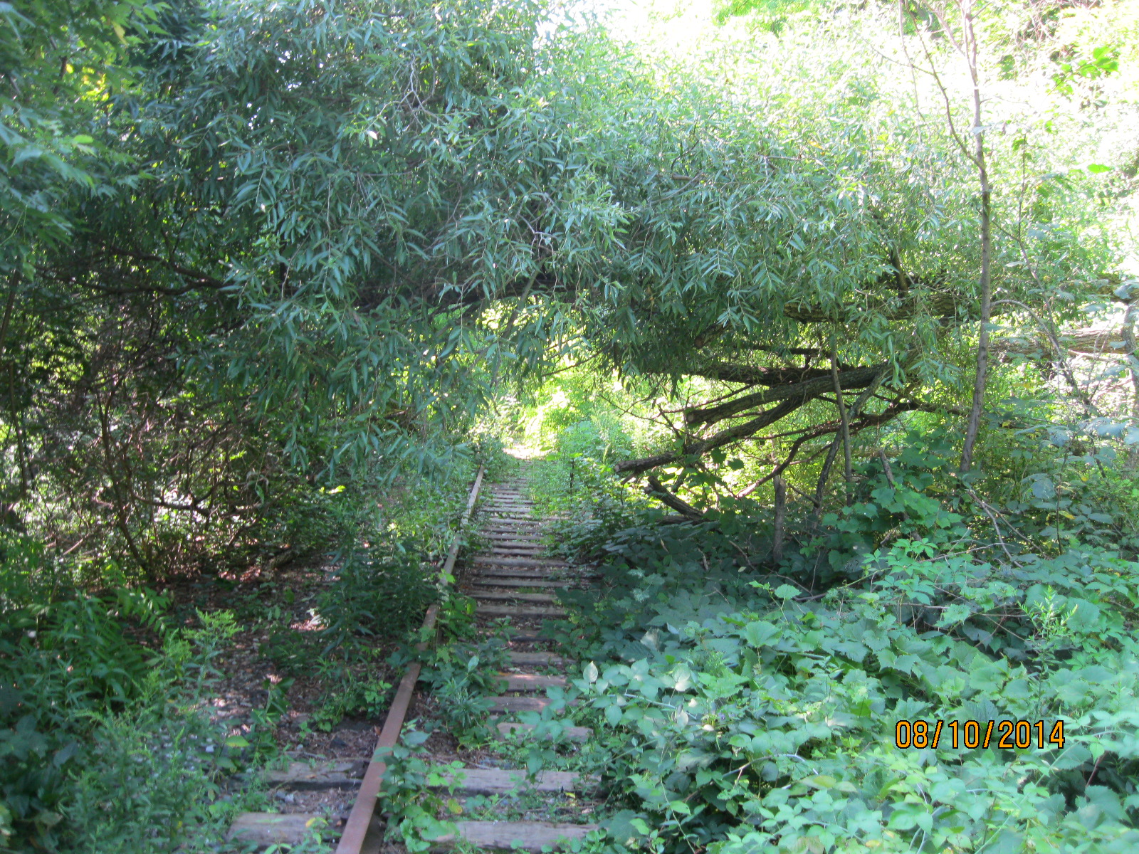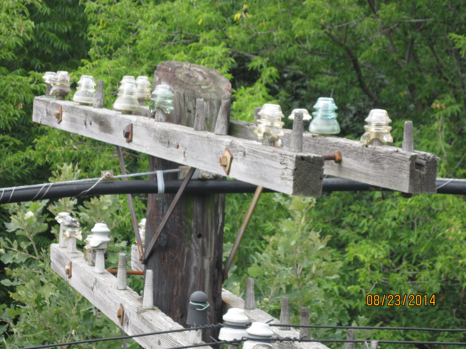 Rail corridors were strung with telegraph wires allowing transmission of information about train positions. When electrical power was spreading in the early 1900’s the utility poles were converted to carry power as well. Glass insulators were patented in the 1880’s and were used where each wire was attached to the pole. In the picture below many of the original ones have been broken off but several good examples remain. The light blue ones are possibly older than the clear glass style but to know for sure a date is usually embossed on the right side of the molder’s logo.