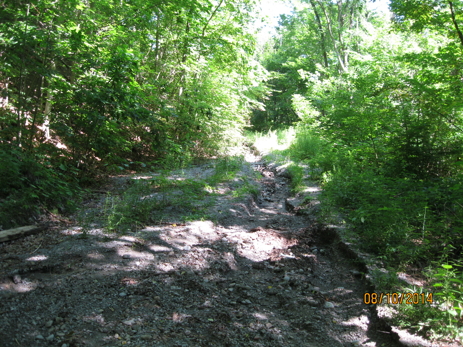 A sluice gate is used to control the flow of water at a mill site. By raising and lowering the gate a mill could control the speed of the water wheel. At Barbertown the sluice gate was raised and lowered by a hand crank that would have been operated by two people. When water power was finally abandoned here in 1974 the sluice was filled in. Today a tree grows where a deep ditch full of water once ran. The tree has grown almost completely around the steel rod as if to still the works of man even further.