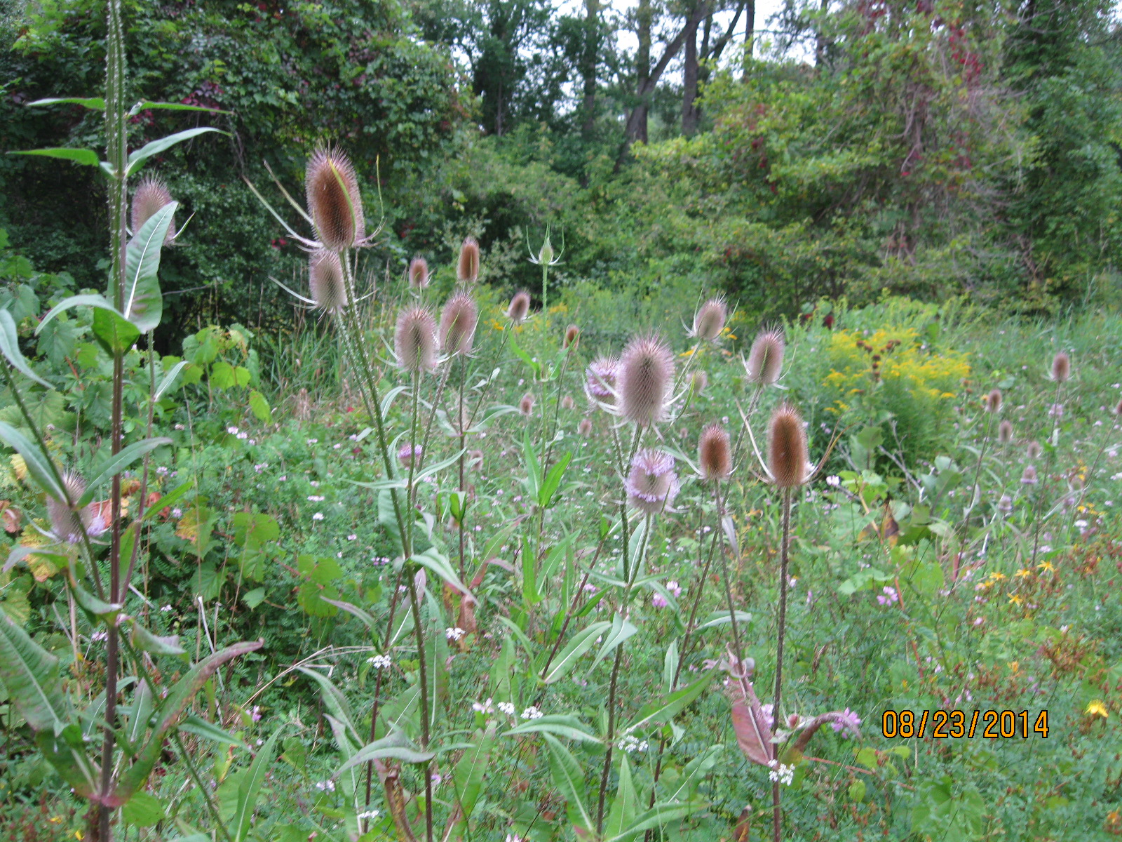 Carding wool is a process which runs the wool through a carding material. We get the word “carding” from the Latin word “carduus” which means teasel. When the Barbers ran their mill, their workers would have used the heads of the teasel plant to draw out the fibres of the wool into long strands that could be spun. Today carding is performed with a set of paddles with many closely spaced pins on them. Teasel plants still grow around the mill property. By mid summer the plant can be up to 2 meters tall with large purple heads on them. The flower forms a purple ring that works its way down the the head as it blooms. The ones pictured below have finished blooming.