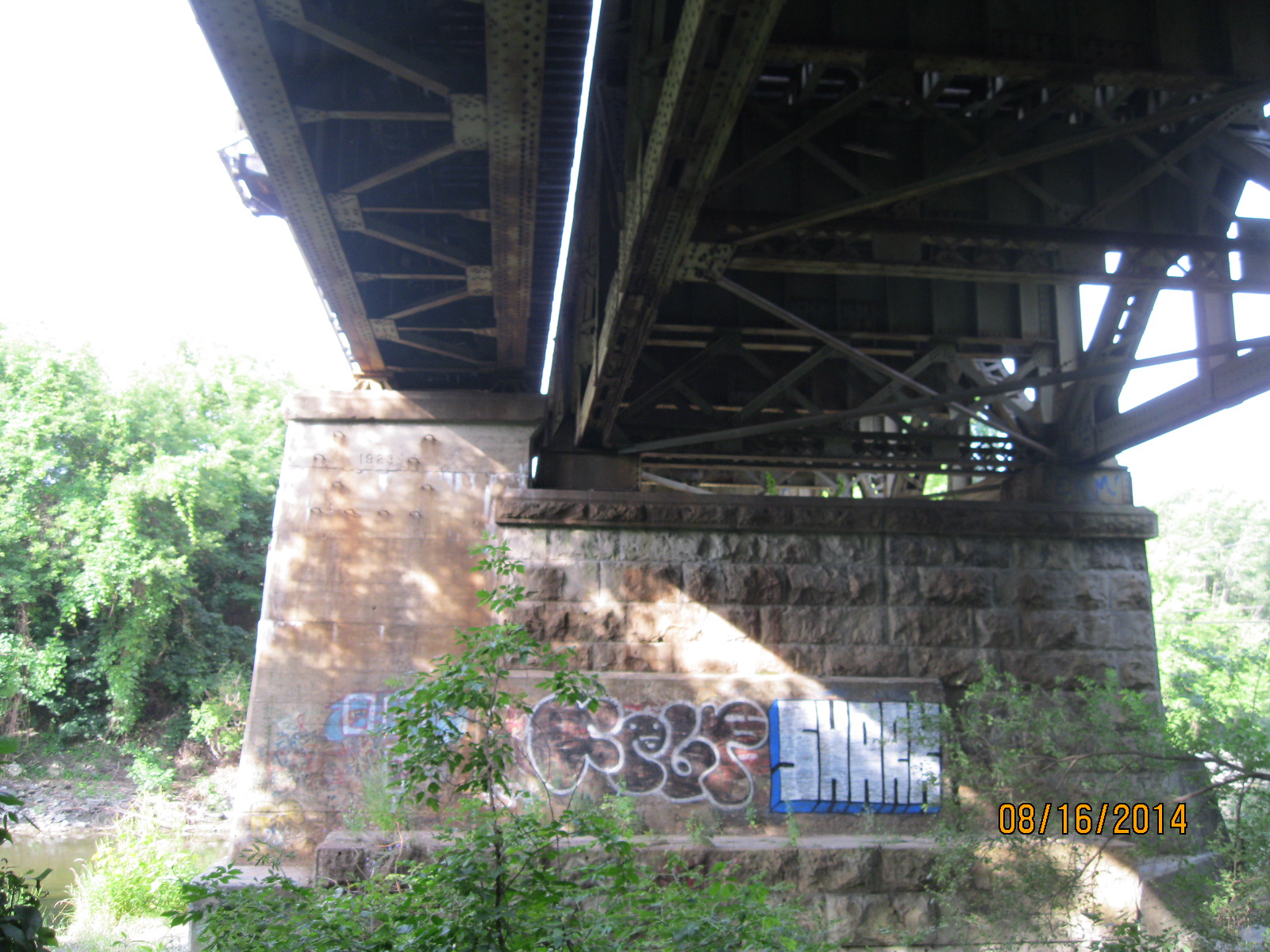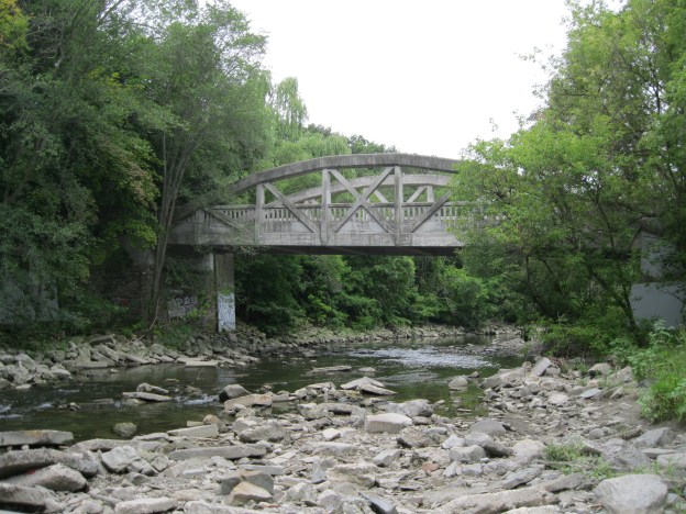 A couple of minutes later we saw the arch of an old bridge poking through the trees. It turns out that this is called Middle Road Bridge and it was built in 1909. It stands on the foundations of an older bridge. Originally designed to carry people and horses it quickly became too small in the days of the automobile as it was 1 lane only. It is the first example in Canada and only the second in North America of a reinforced concrete arch bridge. The Middle Road was a major connection between York and Peel counties. Middle Road got it’s name from the fact that it ran in the middle between Lakeshore Blvd and Dundas Street. Prior to the Queen Elizabeth Way being completed in the late 1930’s this was a major 4 lane road running as far as Hamilton. The portion of the old road which we had seen south of the bridge has been re-named Sherway Drive but it appears to be suffering from neglect as well. The bridge is protected by two historical societies. One end by Toronto and the other by Mississauga. The cover photo shows the bridge from the western elevation.
