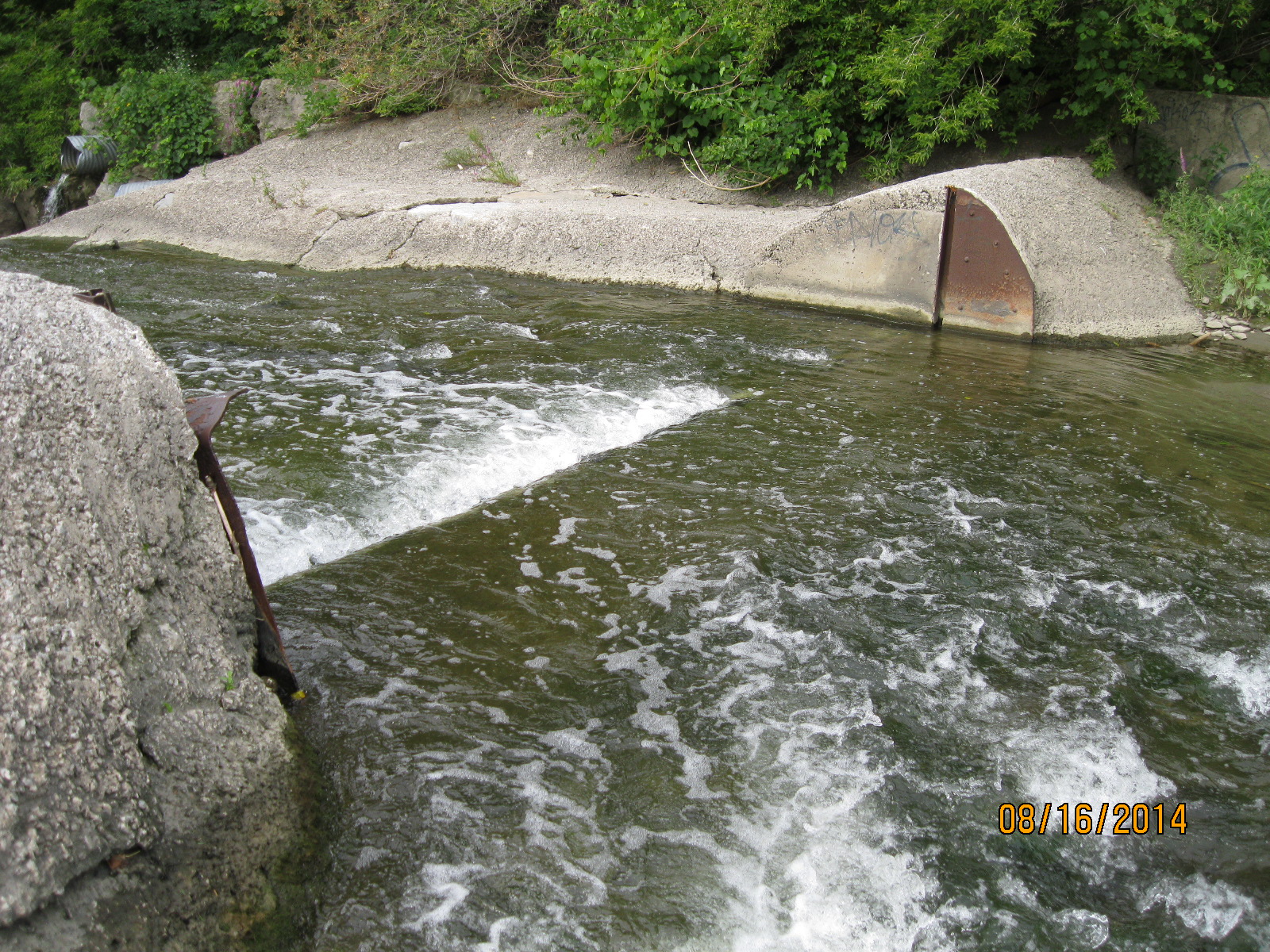 Just north of the tracks is the first old dam on the creek. This dam has retaining walls which extend all the way to the edge of the ravine on both sides of the creek. This is a good example of an old dam as you can clearly see the slots in the river bottom to hold the boards that would retain the water for the mill pond.