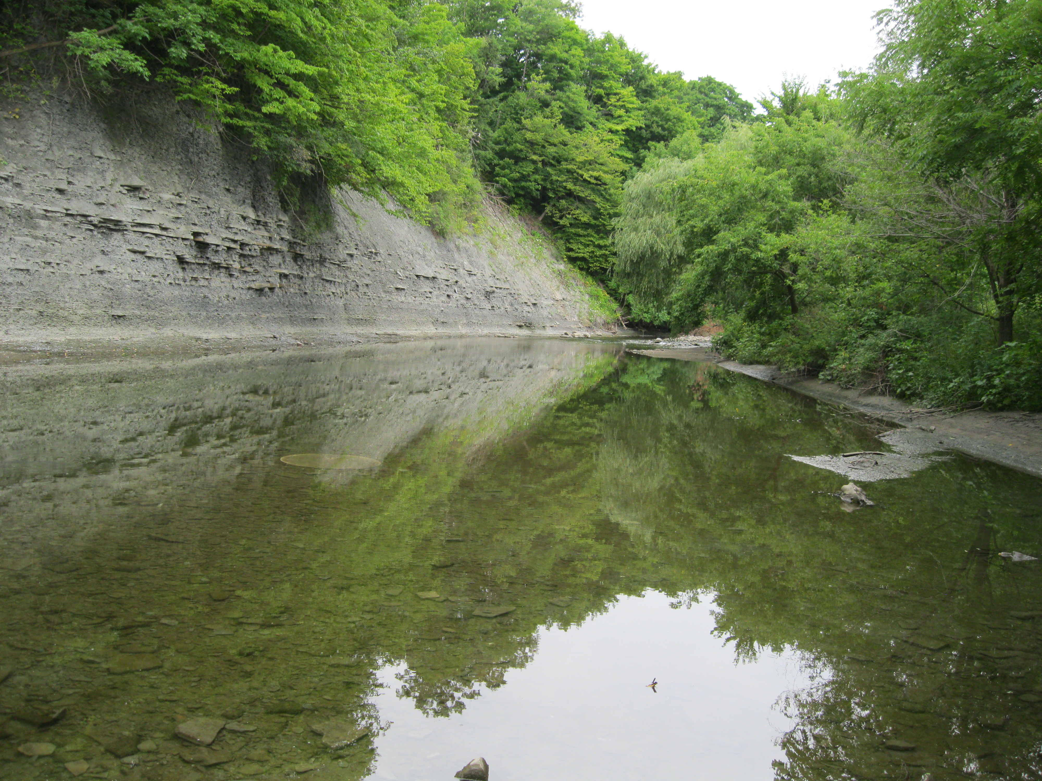 The Etobicoke creek was calm and clear. The west bank of the creek is a shale cliff which is slowly being eroded away from below. Shale is formed from fine particles of sand that is deposited in slow moving water.