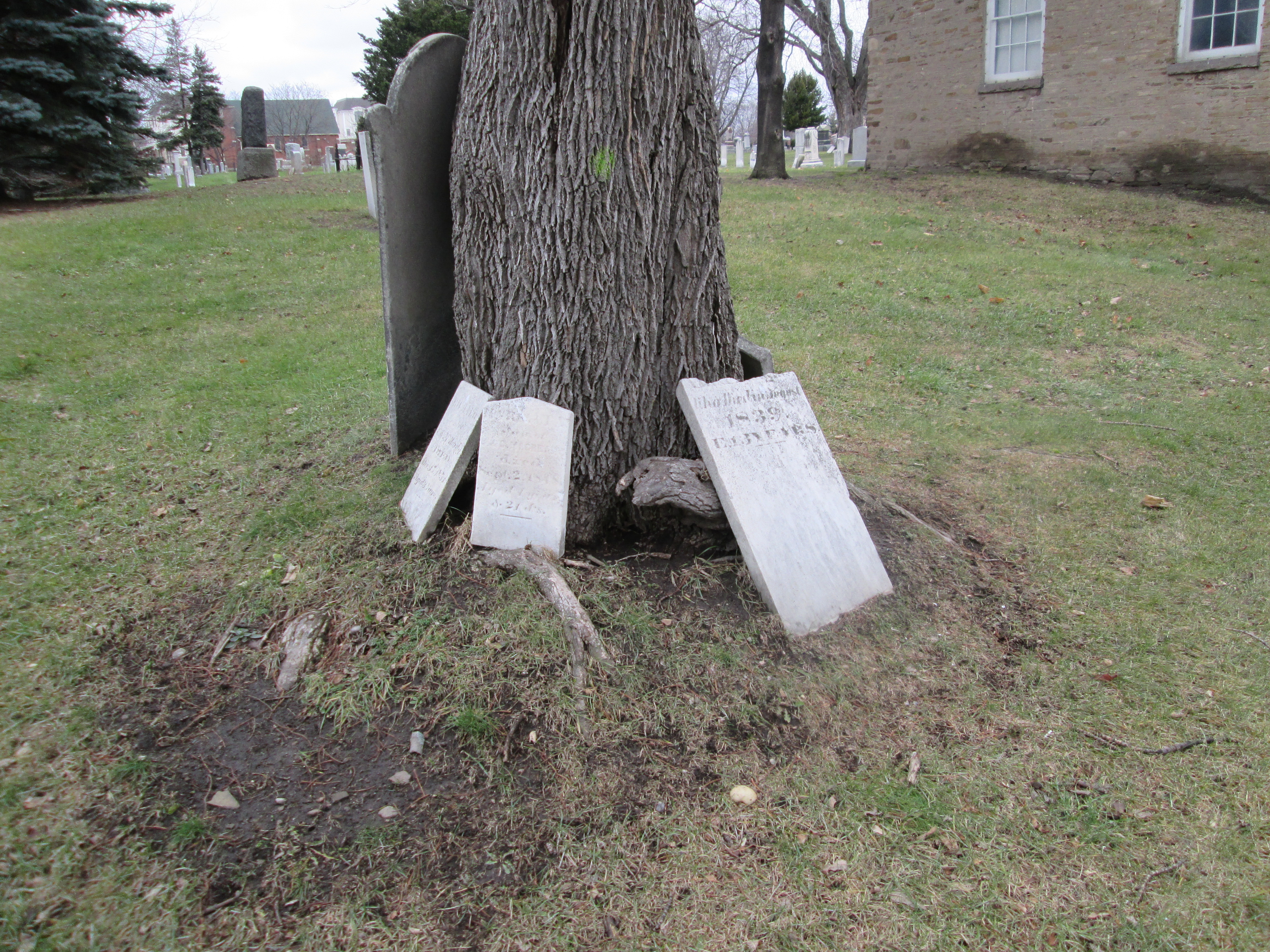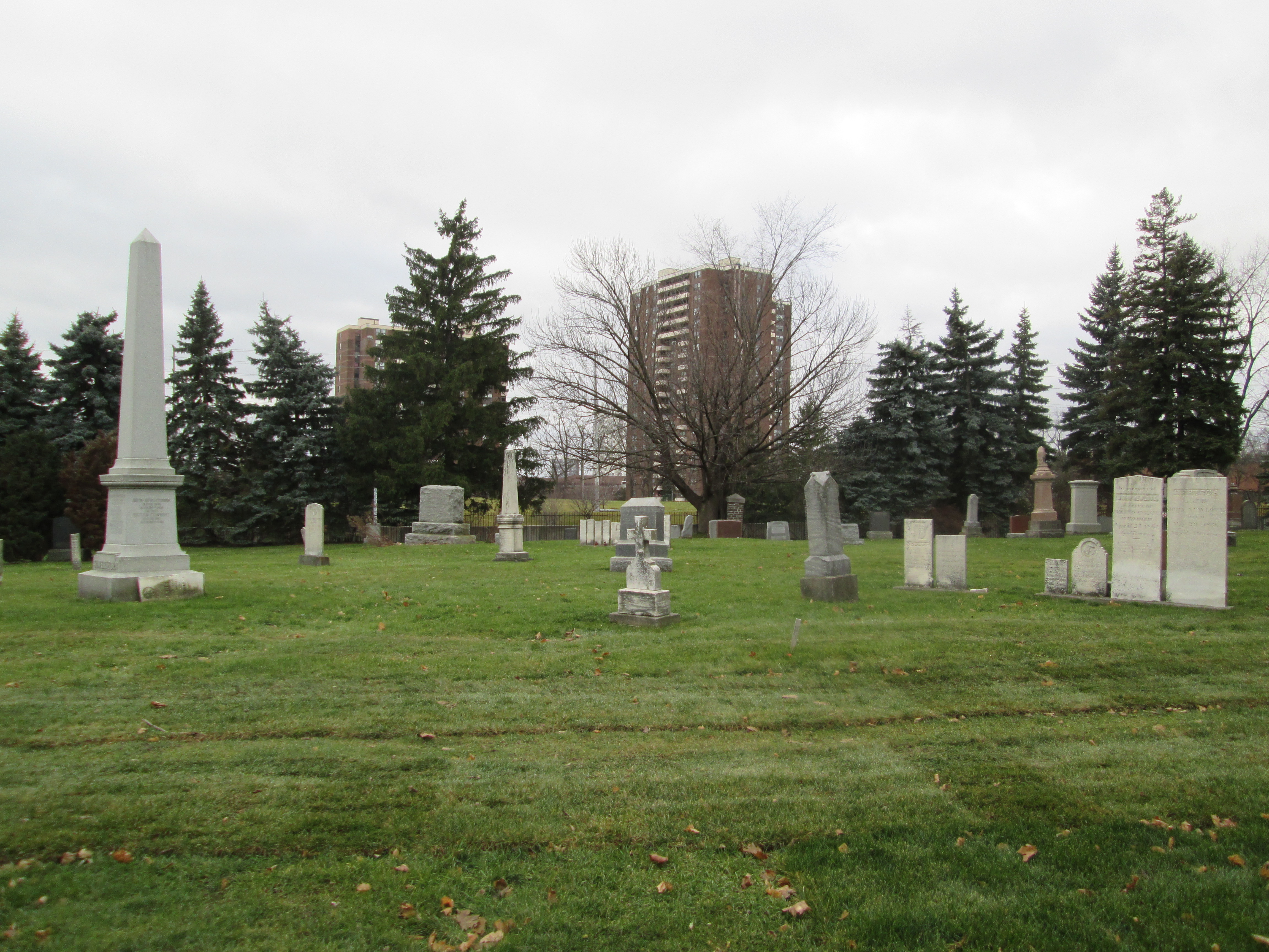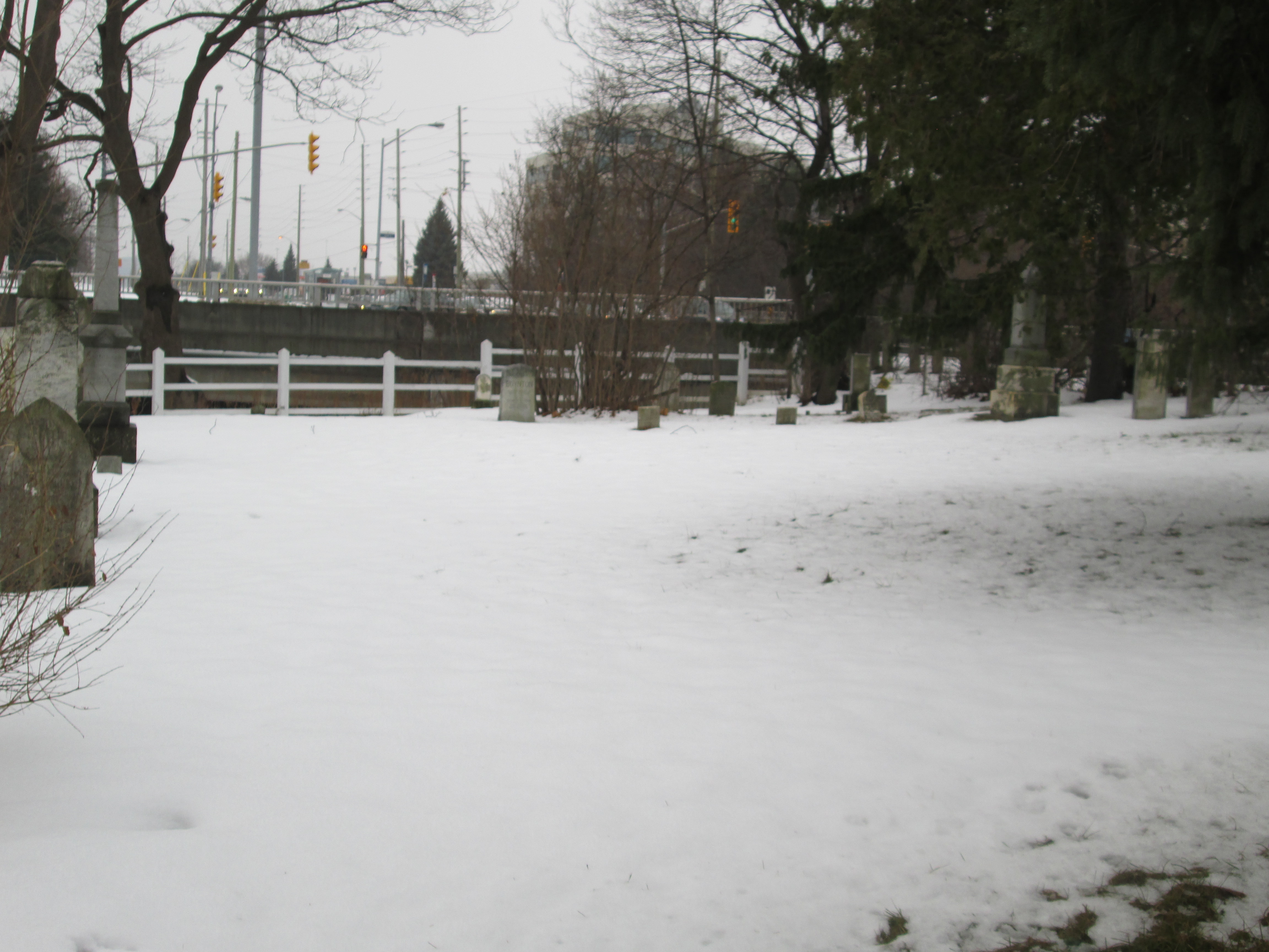 This is the only graveyard in Mississauga that existed prior to the war of 1812. There are six known burials of militiamen who served in that conflict. Some older tombstones here run at a 45 degree angle to the general grid pattern of the grave markers. These “angled” ones run with their feet facing the east to allow the dead to rise facing the dawn on judgement day. Other denominations tend to have their tombstones run parallel to the property lines. As this is a union cemetery there is a mix of these two traditions making this rather unique. In the picture below the tall marker on the left is for the Silverthorne family, including Joseph. The two white stones on the right, along with the four shorter ones to their left, are angled facing east.