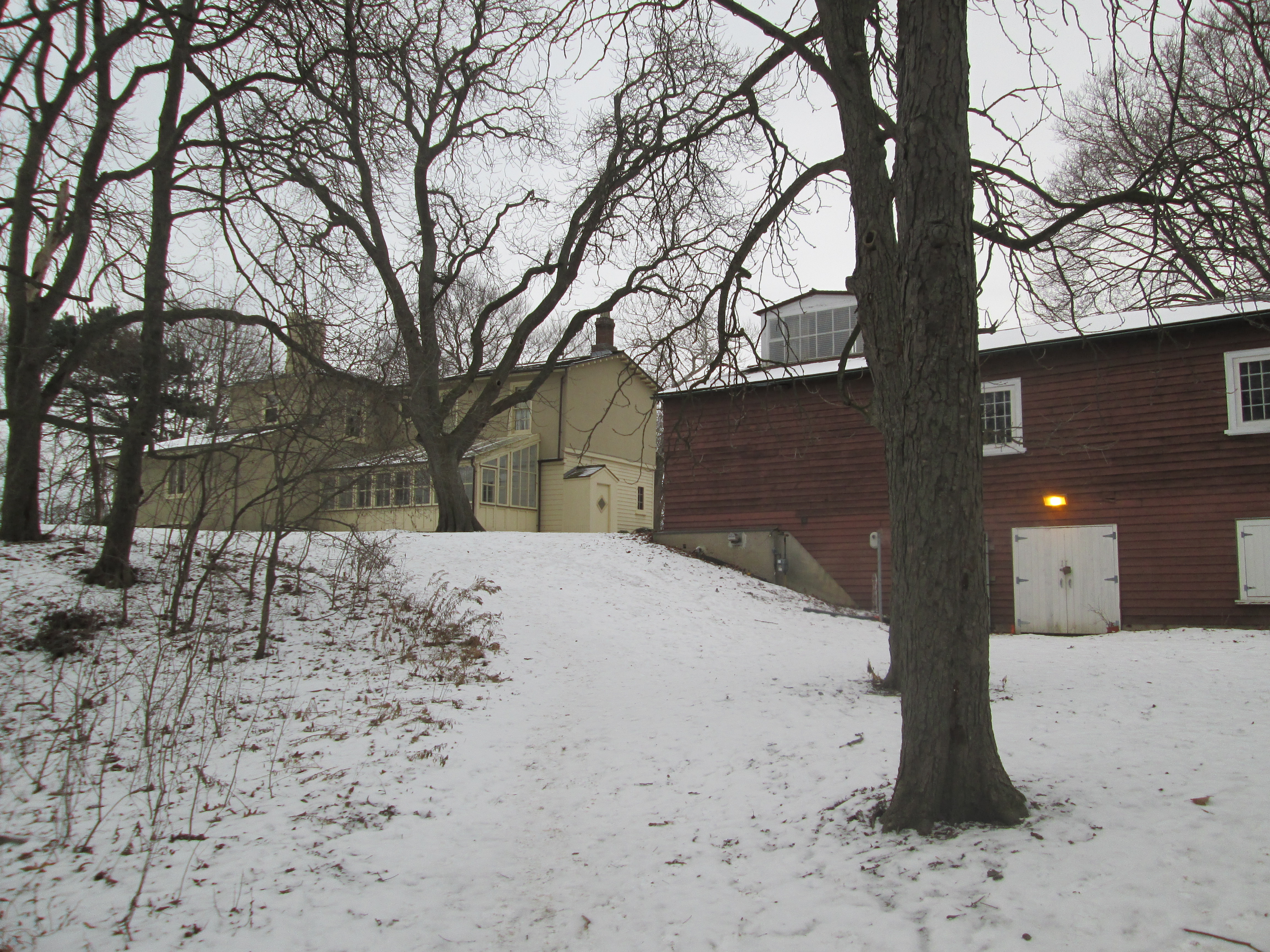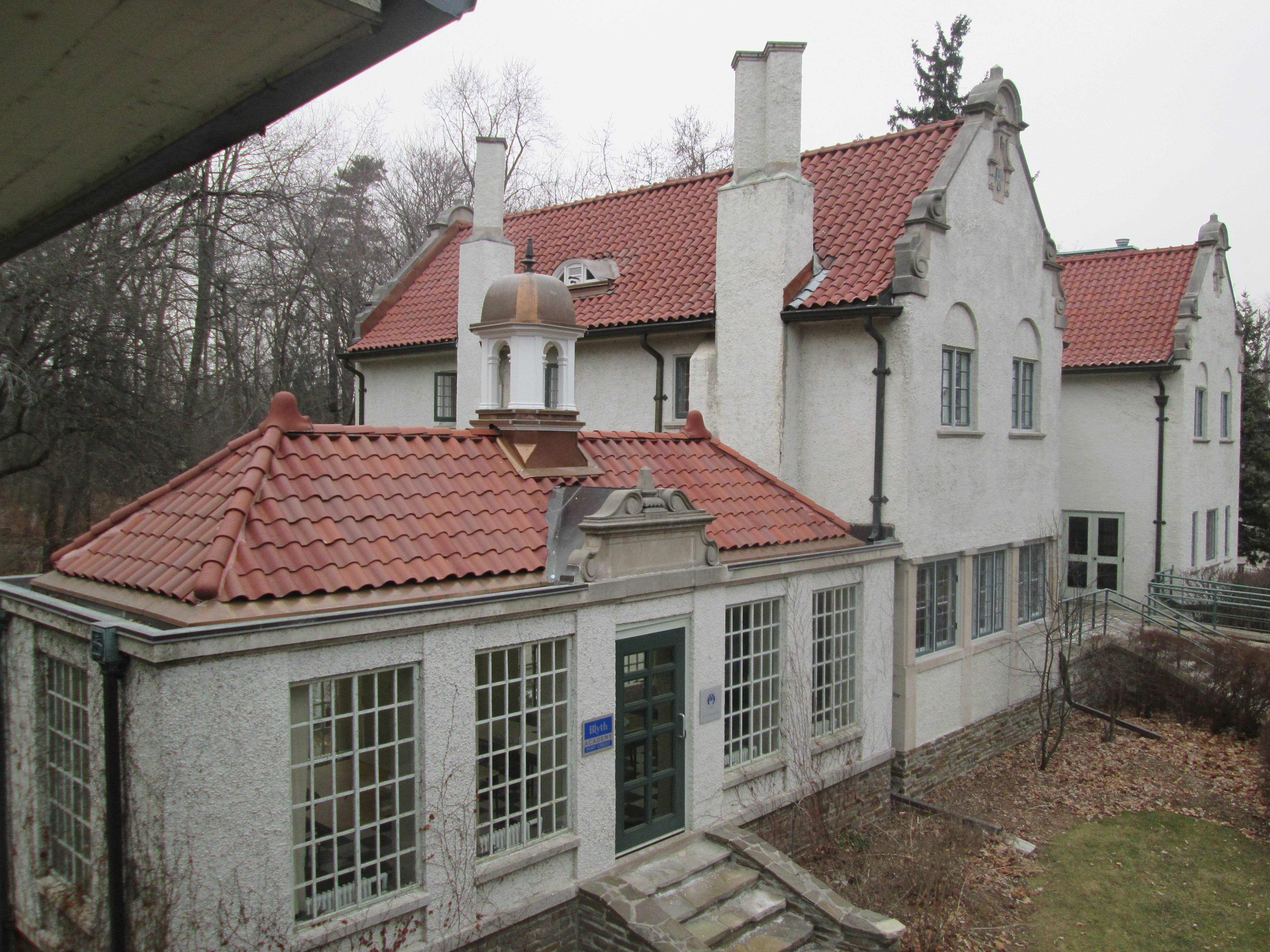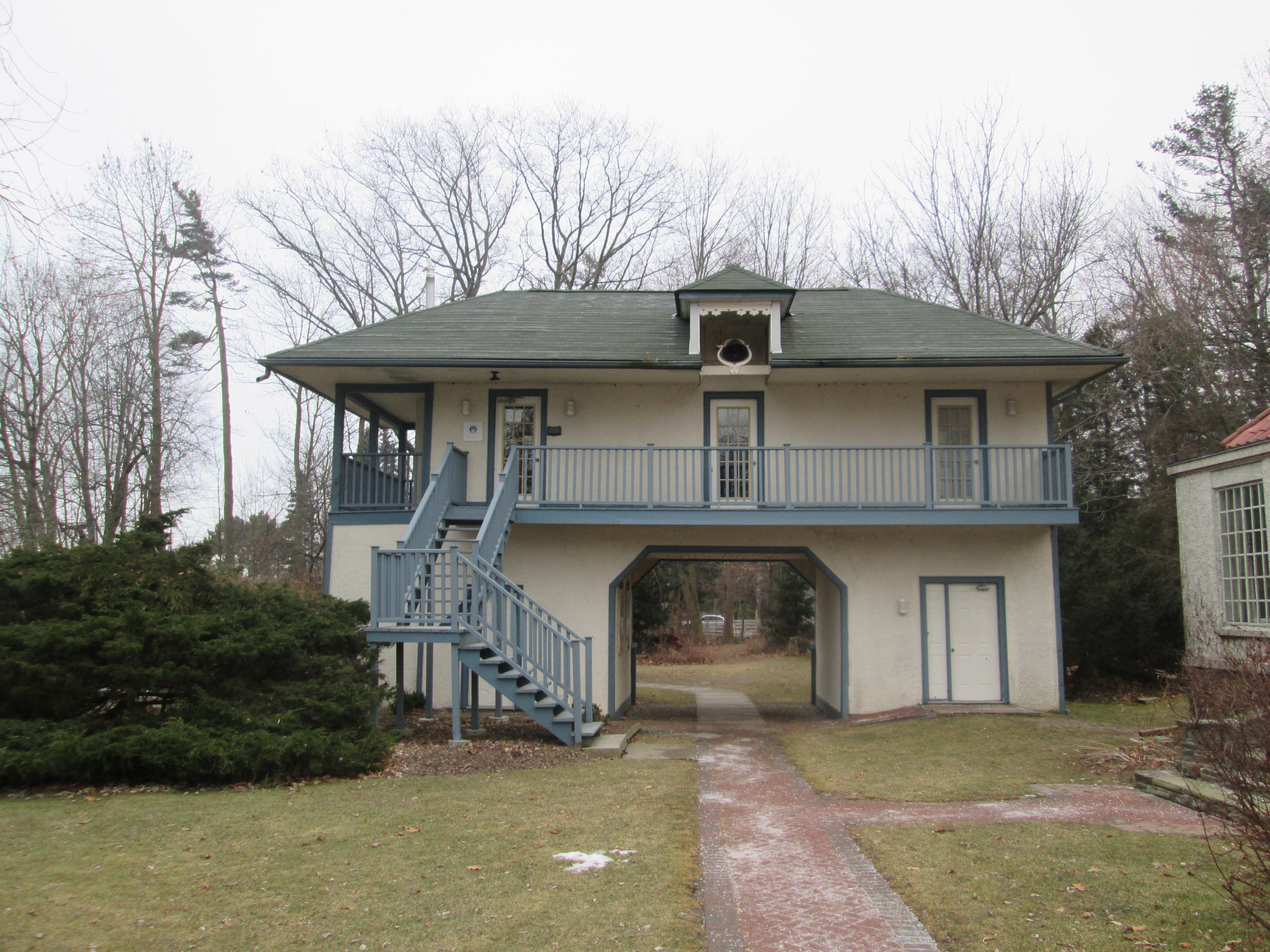 The main house was built over the winter of 1919-1920 and it’s date stone is featured in the cover photo. It replaced a summer cottage from 1866 that stood between it and the lake. The site of the original log cabin from 1809 was identified in 1991 and stood close to the water front. It appears that each time the family built a new home they moved a few feet further away from the lake. This view is taken from the upstairs balcony below the bell on the gatehouse.