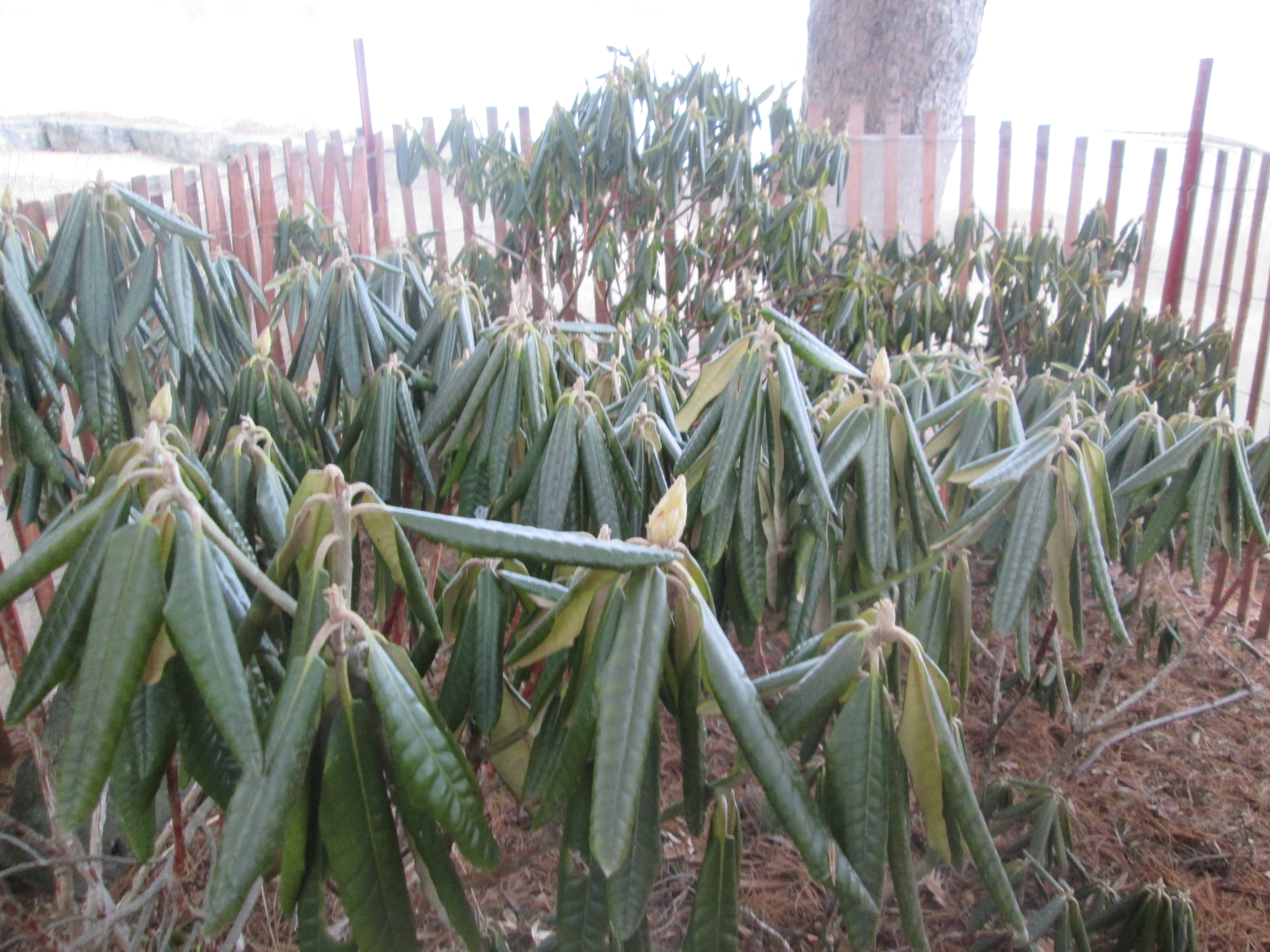 Rhododendron gardens grow under the evergreen trees on the front lawns of the house.