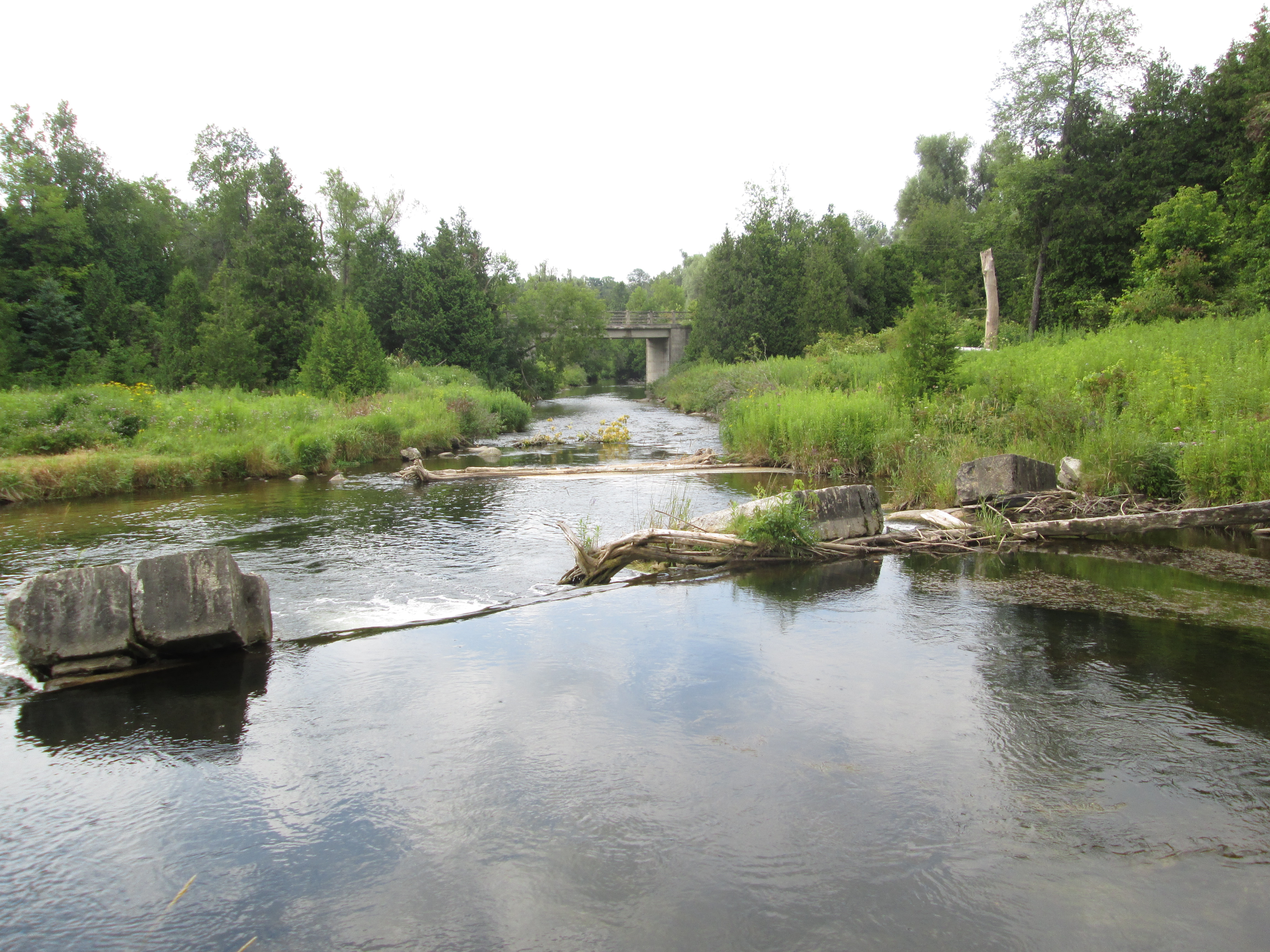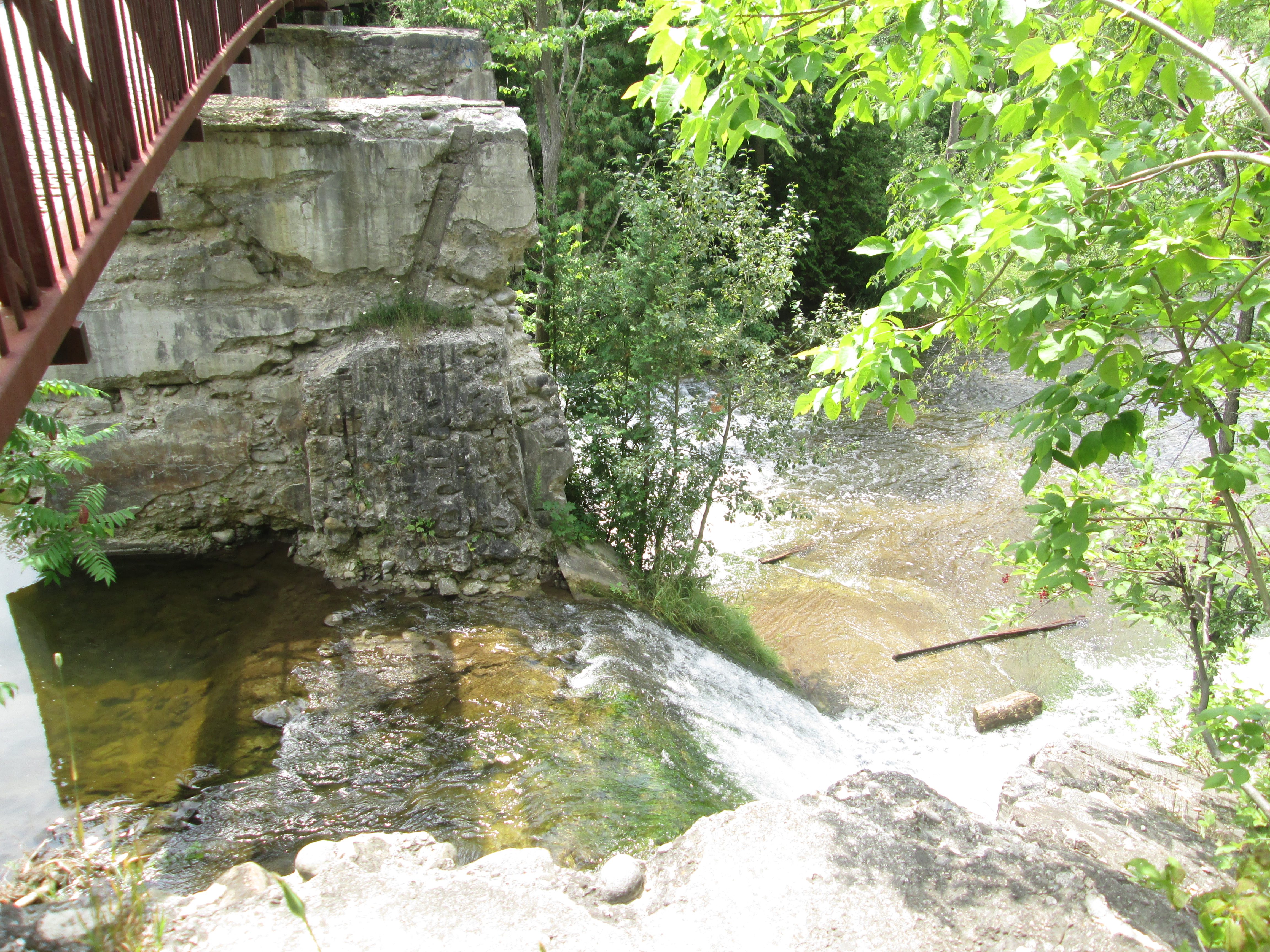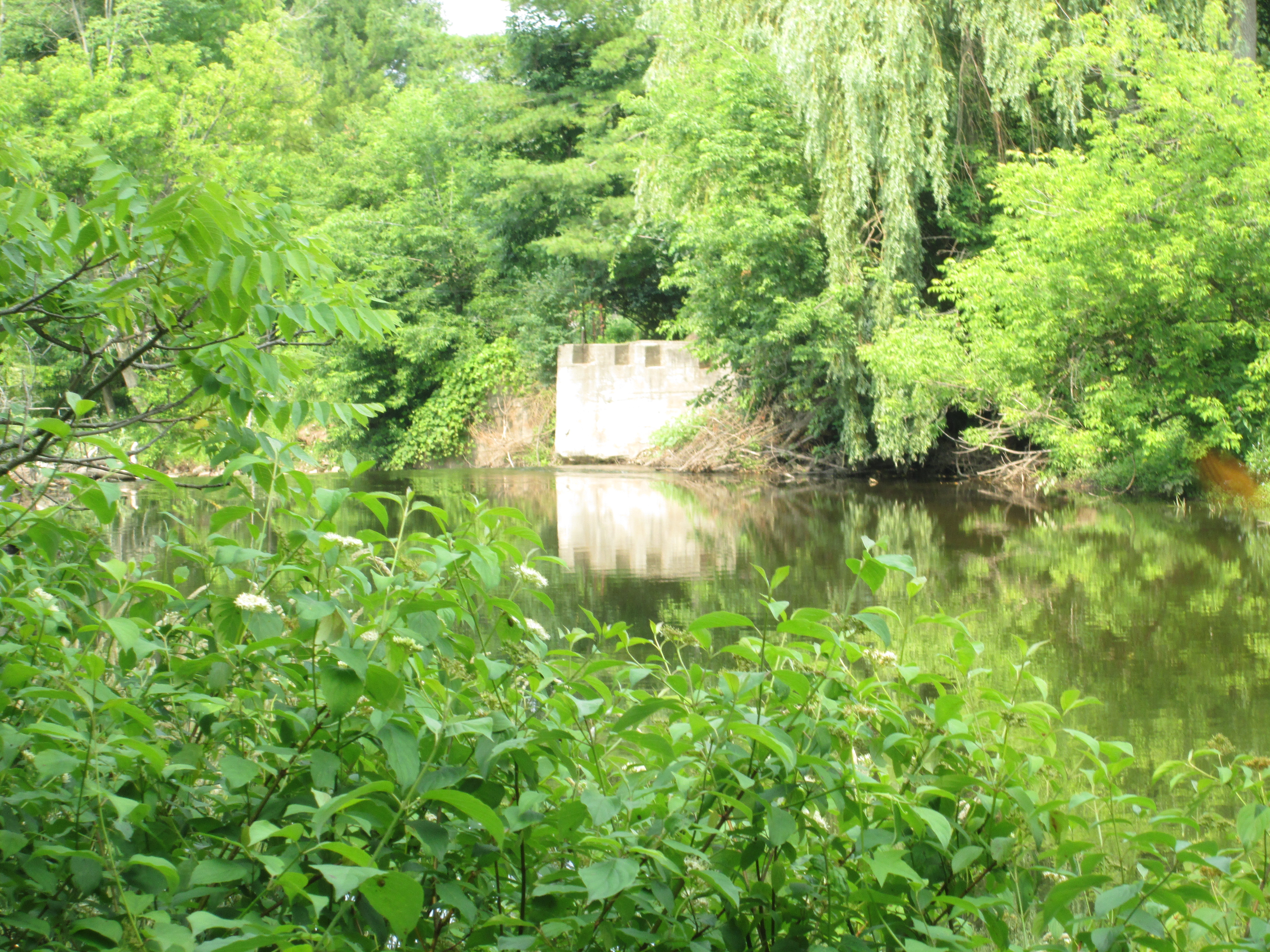 There are several places along the river where evidence of former dams still exist. This picture shows one of these sites which is just upstream from the Quarry Dr. bridge, seen in the back ground. Another concrete structure stands on the opposite river bank just down stream from the bridge.