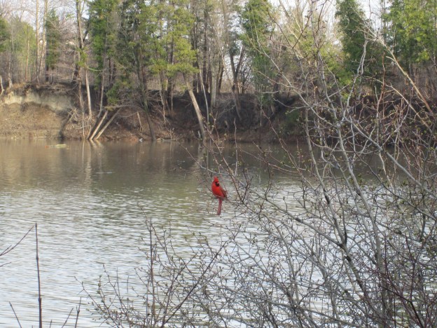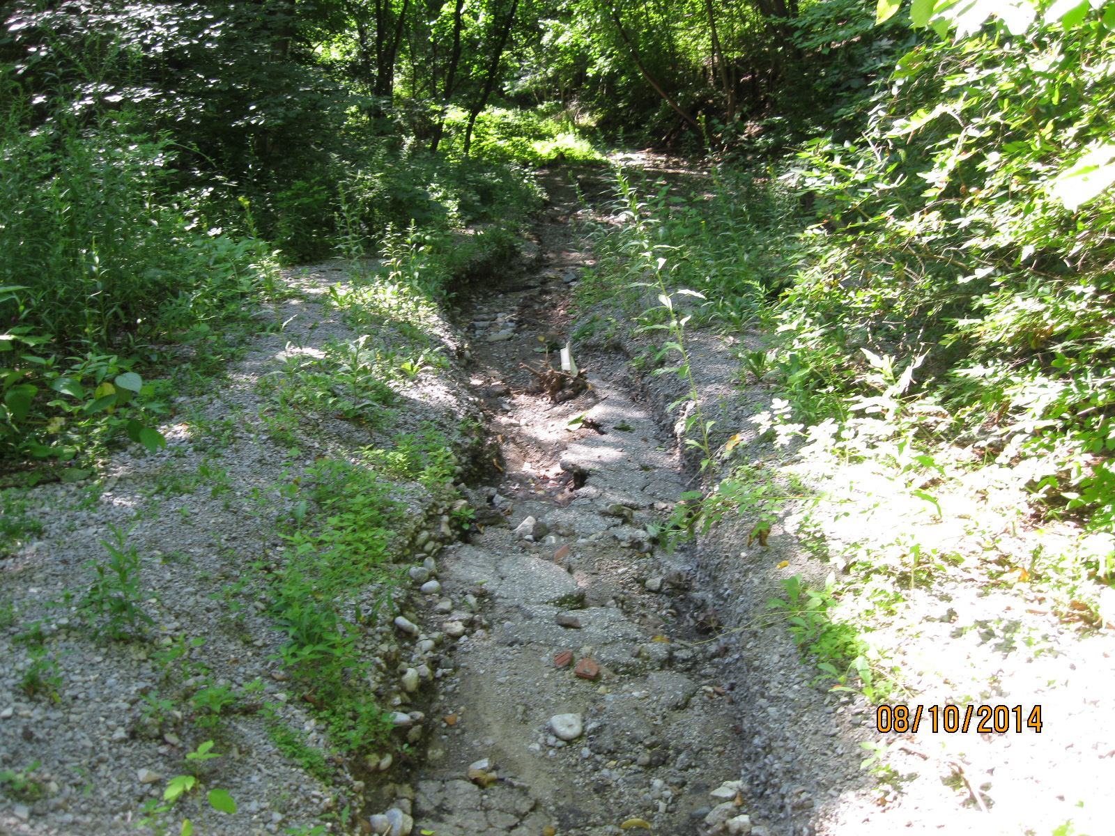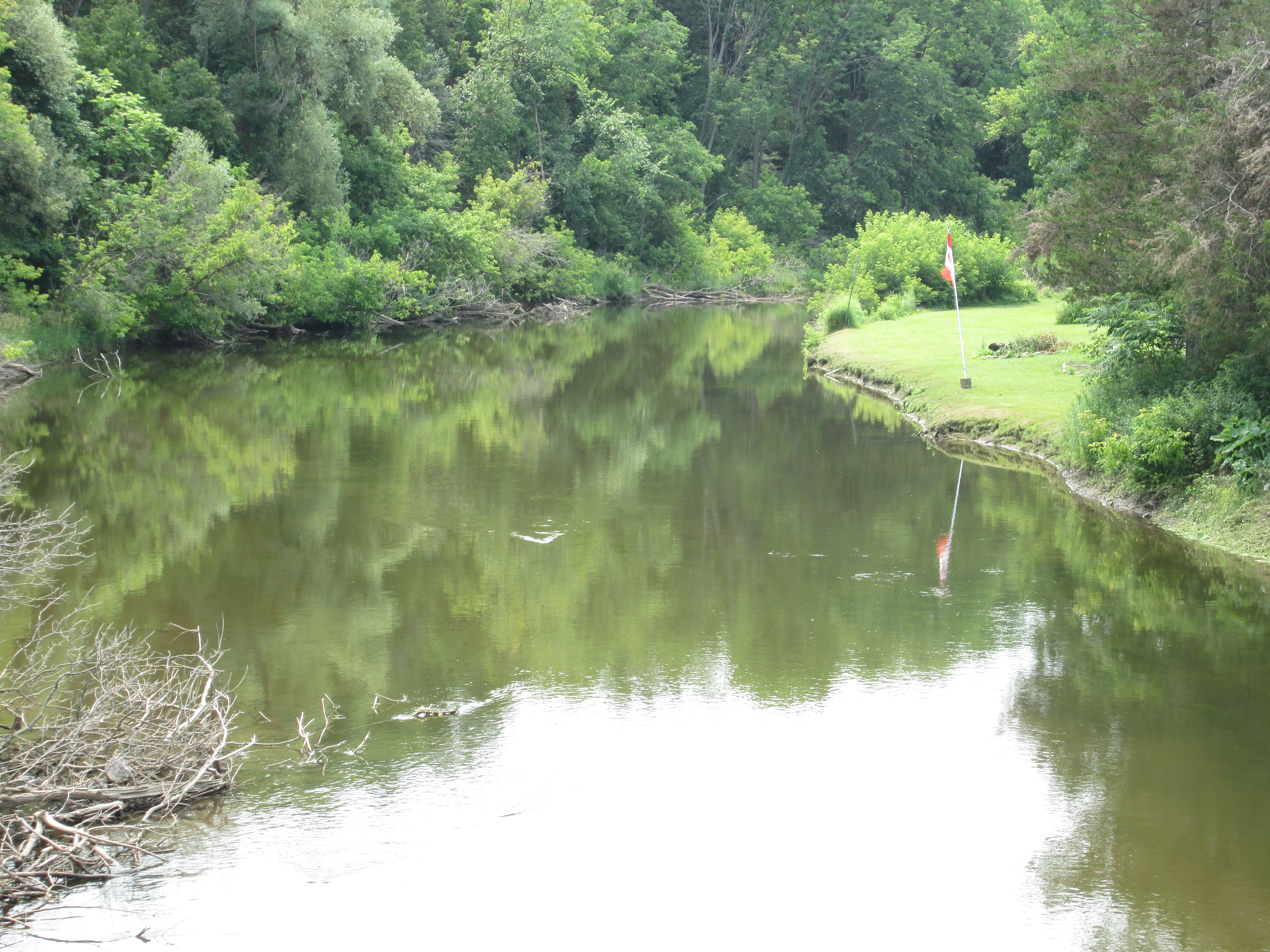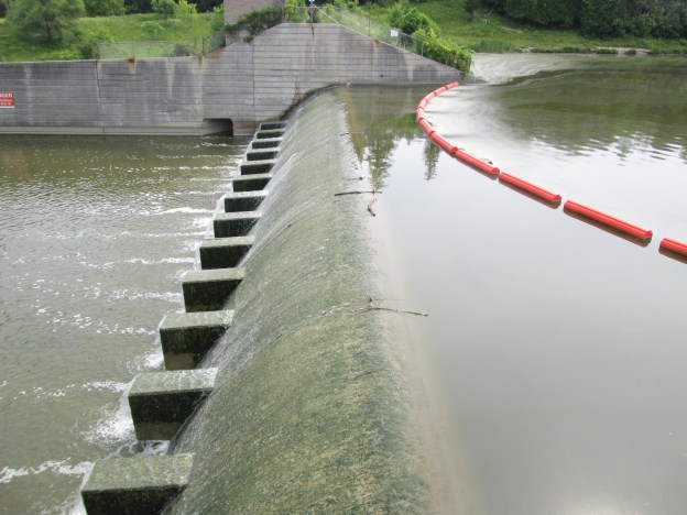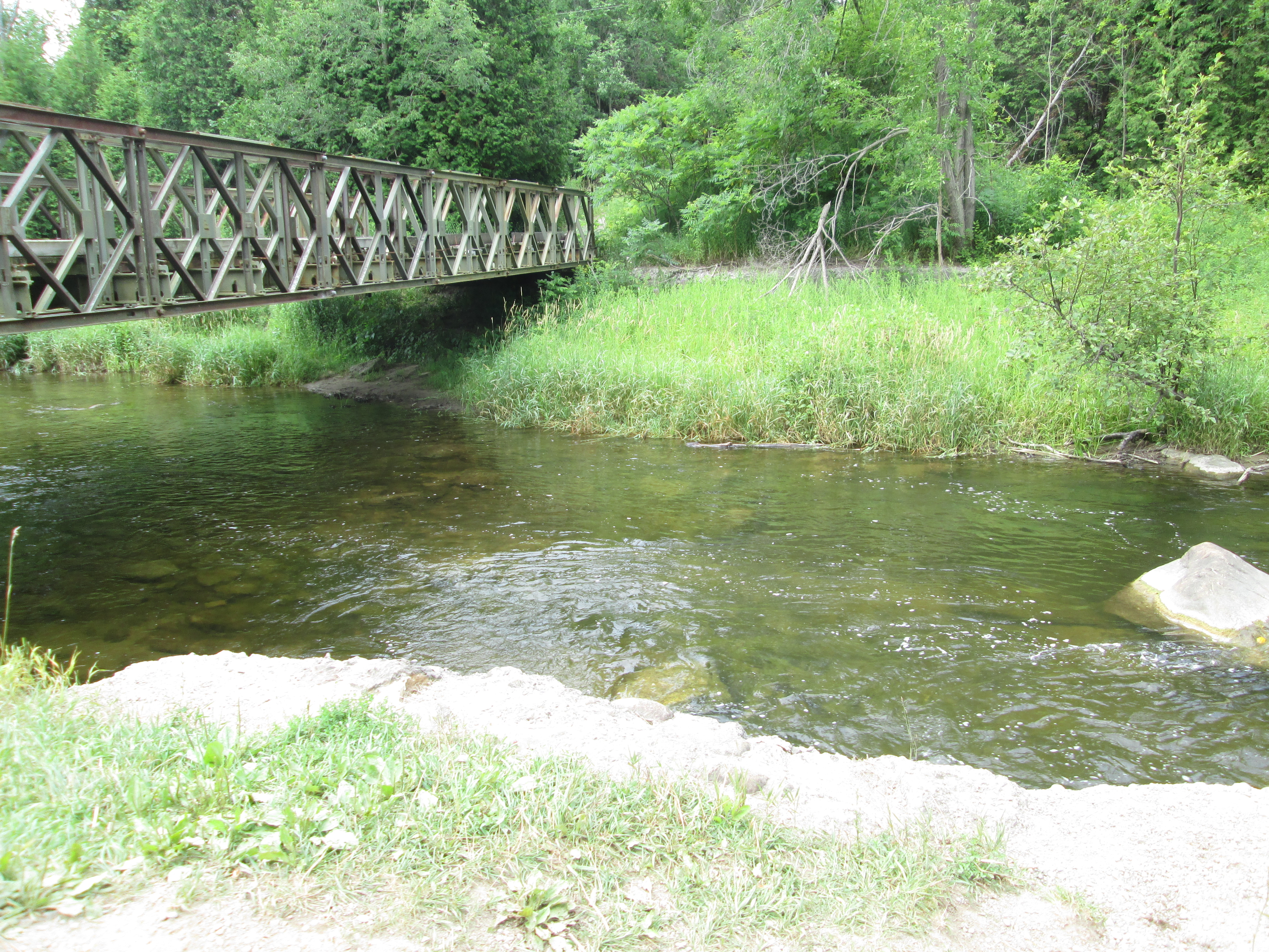 There are several places along the river where evidence of former dams still exist. This picture shows one of these sites which is just upstream from the Quarry Dr. bridge, seen in the back ground. Another concrete structure stands on the opposite river bank just down stream from the bridge.