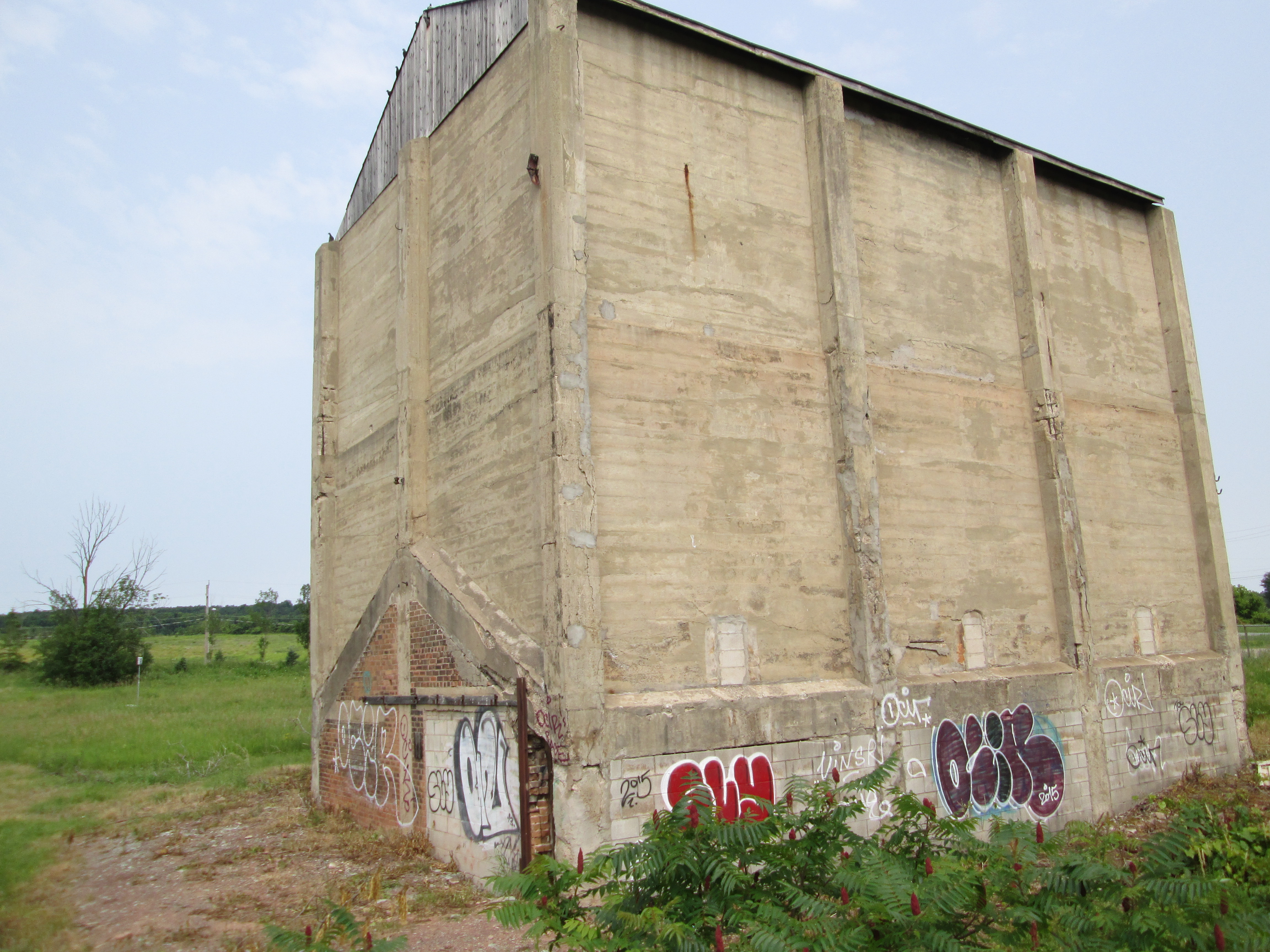 After the flood of 1912 Deagle rebuilt his mill but sold the power plant just three years later. After several ownership changes it was under the control of the Caledon Electric Company by 1925. Ontario Hydro purchased the property in 1944 but due to low water levels they shut the facility down in 1947. The wall below has original Wheeler Brothers stonework in it while the poured concrete in the picture above is a later addition. The water fall upstream is the site of the pre-1912 dam. The riverbank has been reinforced twice to protect the CPR tracks above. The earlier work was done with cut stone and is at water level just below the dam. Concrete was a 20th century addition.