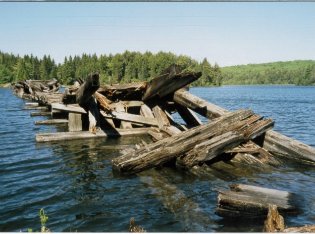 In 1867 Booth purchased the lumber rights for 250 square miles of pine forest on the Madawaska River in what is now Algonquin Park. Over the next few decades he increased his holdings to over 7,000 square miles of forest. He increased his mill capacity by running 13 band saws and by 1891 he was consuming two million logs per year. Some of his lumber holdings were so remote that it took two years for the logs to reach the mill. Booth began to experiment with barges to move logs and then decided to employ railways to bring his resources to his mill in Ottawa. The picture below is from the western abutment of the trestle as seen from the canoe.