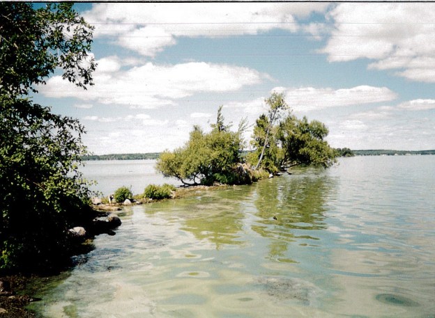 The pictures in this story were taken in May 1998 on a camping trip to Algonquin Park with my youngest brother. The picture below shows the Cache Lake trestle in the distance. The trestle is above the water line for the first half of the span on the east end but the section on the west (right hand side) is concealed. We determined to visit both ends of the trestle by canoe.