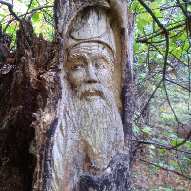 In the Enchanted Area there are several faces carved into the knots on the trees. As you enter the area you are greeted by Merlin himself. His face is shown in the cover photo but the carving is starting to be hidden by a new growth of bushes and grape vines. Elves, fairies, and nymphs are seen in addition to Merlin’s apprentice who is weathering badly. The face of a woman is seen in the tree below.