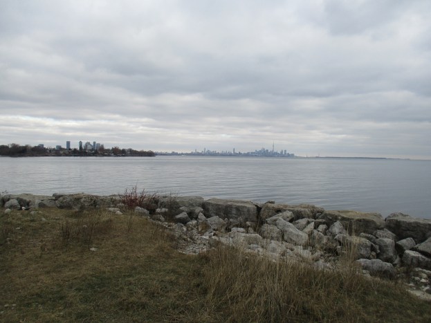 Looking from the east when you reach the beach, the pedestrian arch bridge can be seen over the mouth of the Humber River. Some of the breakwall can be seen in the lake.