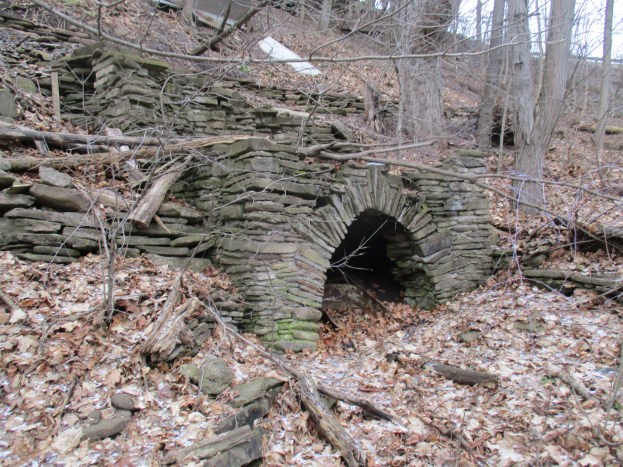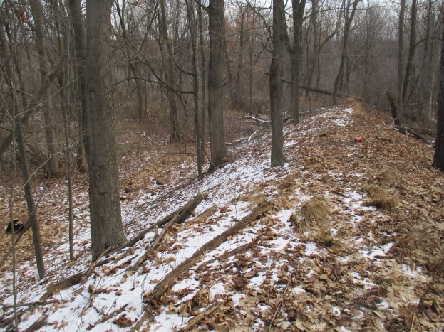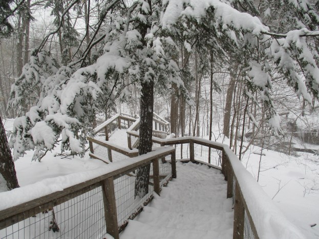 Both sides of the trail are marked as environmentally sensitive and hikers are asked to remain on the main trail. Thirty rare plant species and the Jefferson Salamander are being protected in these woods. Eastern Skunk Cabbage grows in wetlands and the woods along the trail support a large colony of plants. Skunk Cabbage is one of only a few plants known for its thermogenesis properties. It can produce temperatures from 15 to 35 degrees celsius above the surrounding air. It literally melts its way through the frozen ground and often blooms through the snow. The leaves do not surface until later in the spring.