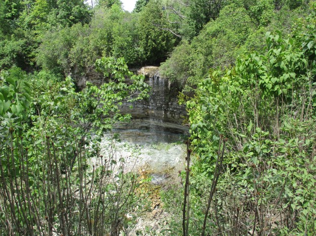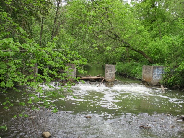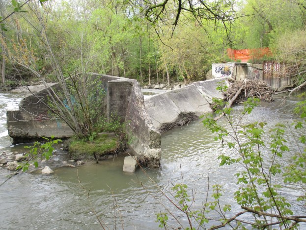 Crossing under the new Cummer Road bridge, the trail quickly follows a pedestrian bridge to the east side of the Don River. We chose a small path that led along the west side but after crossing a drainage ditch the trail quickly vanished. Our intention was to find any evidence of the mill site or dam that was shown on the county atlas. The mill appears to have been somewhere near the new bridge and no trace exists. The concrete dam we found on Cooper’s property would have been built here long after the mill had closed and would have replaced a wood crib dam. The mill pond shown on the map has been drained. The cover photo shows the dam from the downstream side while the picture below shows the upstream side.