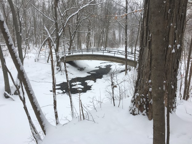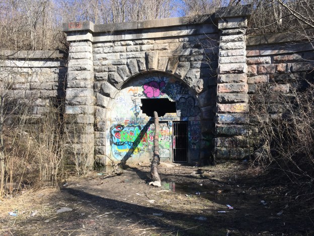 Once you pass the dam you will be forced out onto a service road that isn’t on the archive aerial photograph above. The road passes along the side of the GM plant and had sparse traffic on it until now, but as I was unsure if I was actually trespassing I crossed it quickly and looked for a trail in the trees on the other side. Knowing that the train had to approach the tunnel in a ravine that would be close by, I chose to follow the first one. As you can see in the picture below, the west end of the tunnel has been closed off because it was considered unsafe. At times, people have made several holes in the concrete blocks and a few of these have been sealed off again. The door is currently locked but appears to be broken into regularly. Entering from this end would require going up the log and dropping into the tunnel. Being by myself this wasn’t an option.