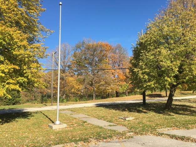 When the housing was built Sheppard Avenue was on the original alignment. When it was realigned and widened a new bridge was built to allow easy access for personnel to get to work at the base. At the foot of the bridge stand two larger parking lots that still retain one flag pole. A mounting plate for a second one can be seen on the right of the sidewalk. Perhaps the park could one day fly the Canadian and Provincial flags at the corner of Keele and Sheppard. This little piece of grass with the flag poles was on the south side of the original alignment of Sheppard Avenue which can be seen in the background of the picture below.