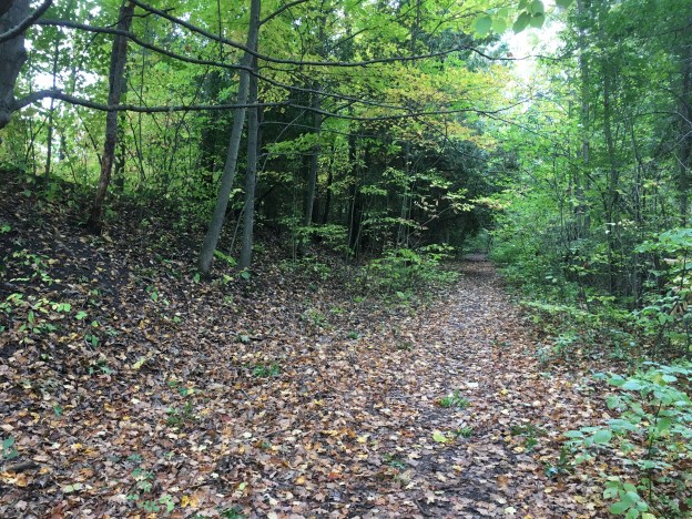 My exploration began in the Port Hope Conservation Area. One of the hiking trails following the north side of the river follows the old right of way for the railway. As you walk along the trail you will see that you are following a berm that is occasionally replaced by wide embankments where the rail line cut through small hills to create a level roadway. Material taken from the cuts was used to build the berm through the hollows. The picture below shows some of the cut embankment on the right of the shot.