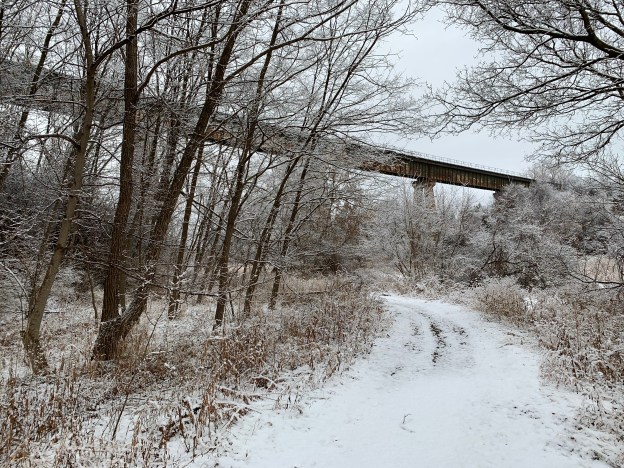 The trail climbs over the small rise of one of the city of Vaughan’s storm water management ponds. Basaltic Pond is known as a dry pond because there is normally no water present. During a major storm event the berm and dam serve to retain water. The pond can reach the level of the top of the dam before it spills over. Should the water level exceed the storage capacity of the pond there is a series of concrete posts known as a dissipation weir that the water must flow through. This allows the energy that the water gained by falling from the top of the dam to be released before it can cause significant erosion downstream.
