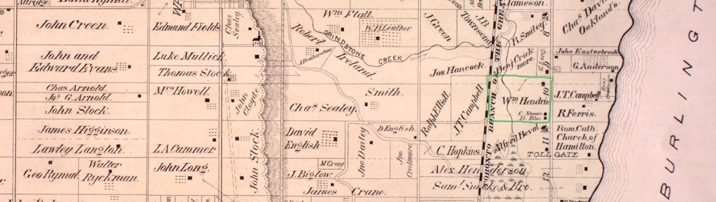 Hendrie Valley is a 100-hectare section of the Grindstone Creek Valley which has been part of the Royal Botanical Gardens since 1941. Sixty percent of the area is a wetland marsh that is considered to be the best marsh on the western end of Lake Ontario. This part of the larger Royal Botanical Gardens, which covers over 900 hectares and is home to over 750 plant species along with 277 species of migratory birds, 37 species of mammals plus amphibians and reptiles. To enjoy Hendrie Valley you can park where I did on Unsworth Avenue where there are several free spots. If these are all taken there are spots on Plains Road but these ones require a parking fee. William Hendrie came to East Flamborough from Scotland in the 1870’s to purchase land for a racehorse farm. The property was donated to Hamilton Parks Board in 1931 by his son George and then turned over to the Royal Botanical Gardens ten years later. His farm was located downstream from Smokey Hollow and can be seen outlined in green on the county atlas excerpt below.