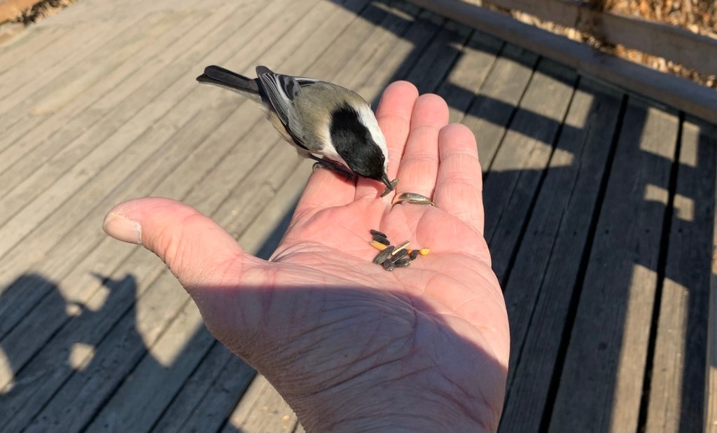 It appears that the visitors to Hendrie Valley routinely leave bird feed along the boardwalk and there was plenty there on this day. This has led to the local birds becoming overly comfortable with people and dependent on them for their primary food source. This isn’t really a good thing but it does lead the Black-capped Chickadees to be quite willing to land on your hand and take a seed. A small Downey Woodpecker came for one as well but didn’t stay to get his picture taken.