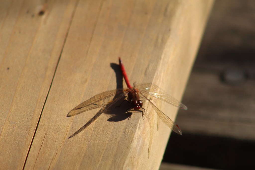 There were several dragonflies taking advantage of the unusually warm day and soaking up the sunshine along the boardwalk. The Half-banded Topper has become scarce as its habitat has been reduced through development. The marshes of Hendrie Valley provide a perfect place for them to breed. When the eggs are ready the mated pair will fly in tandem while she slowly flips her tail through the water to wash the individual eggs off.