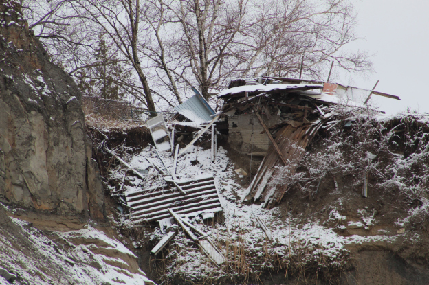 The Hilarious House Of Frightenstein is located just west of the Gates Gully access to the bottom of the Bluffs. Several houses have fallen prey to the forces of erosion as the land has disappeared out from underneath them. The house in this story used to belong to Billy Van who starred in many roles in the TV show The House of Frightenstein. Just a few years ago the property owners were cutting the grass in the back yard of this house which today is almost completely destroyed.
