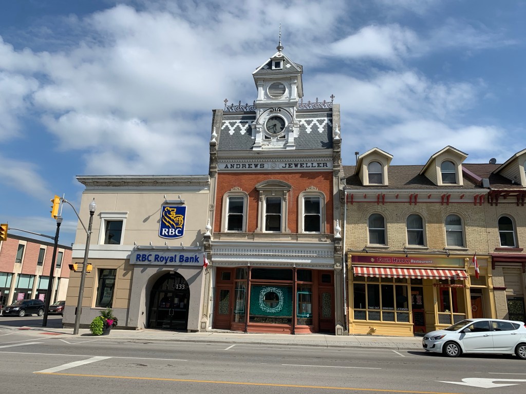 Andrews Jewelers has been a fixture in St. Marys since 1869. The Andrews family had arrived in town in 1857 when Henry Andrews came to lend his stone mason skills to the stone abutments of the London Bridge. William Andrews replaced his original frame shop with a building that was considered to be architect and mason William Williams’ masterpiece. Opened in 1884 it is a rare example of a building that is essentially unaltered inside or out. The side and rear walls are made of St. Marys limestone while the front is made of bricks with finely worked stone dressings. The clock is 4.5 feet in diameter and cost over $1,000, about $25,000 in modern currency.