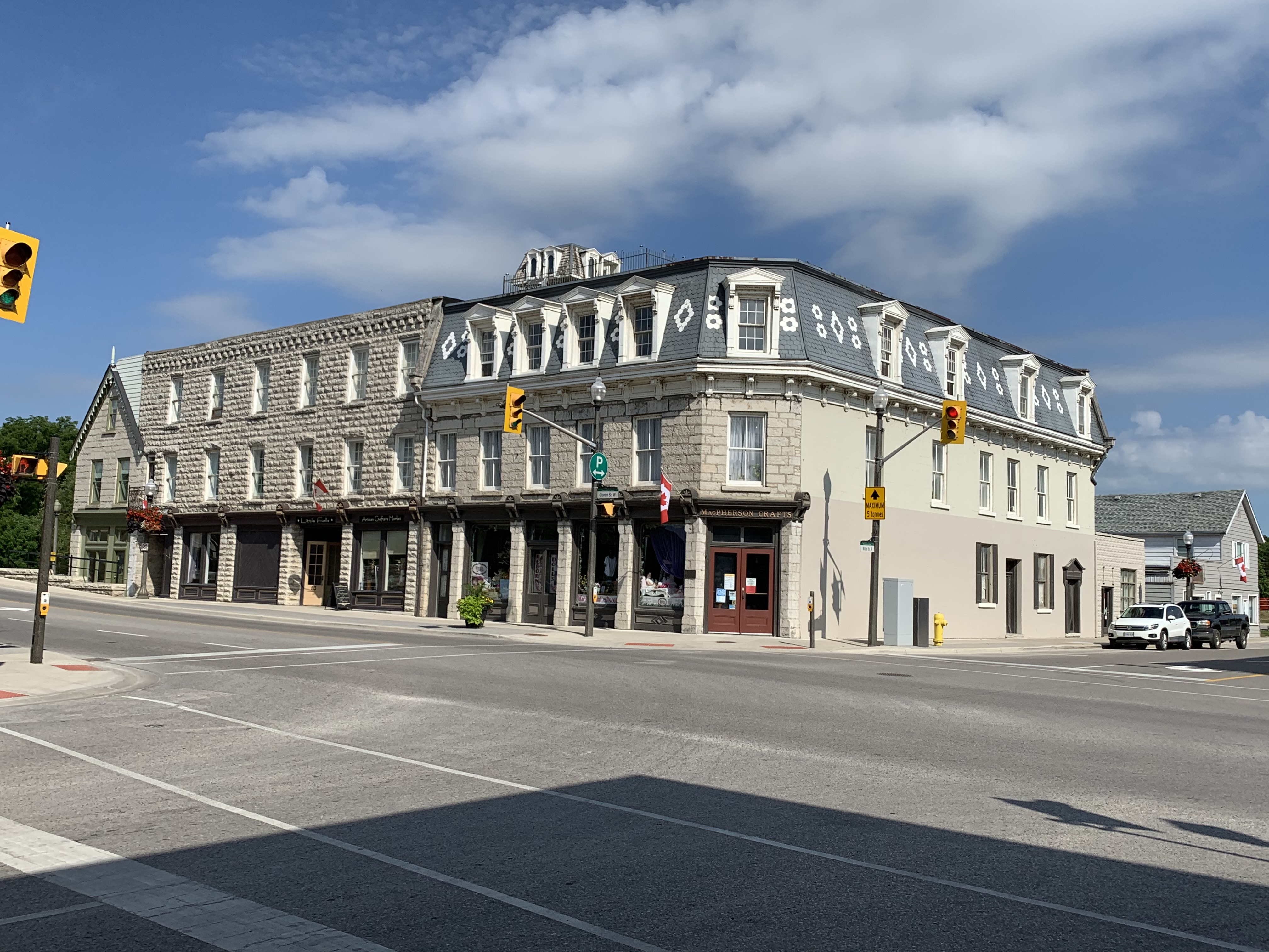 The limestone block to the south of the Opera House was built in 1868 to serve as a store for Theodore Hutton with his residence above. Starting in the 1930’s it served as as a drill hall for the local militia and is also known as the armouries building.