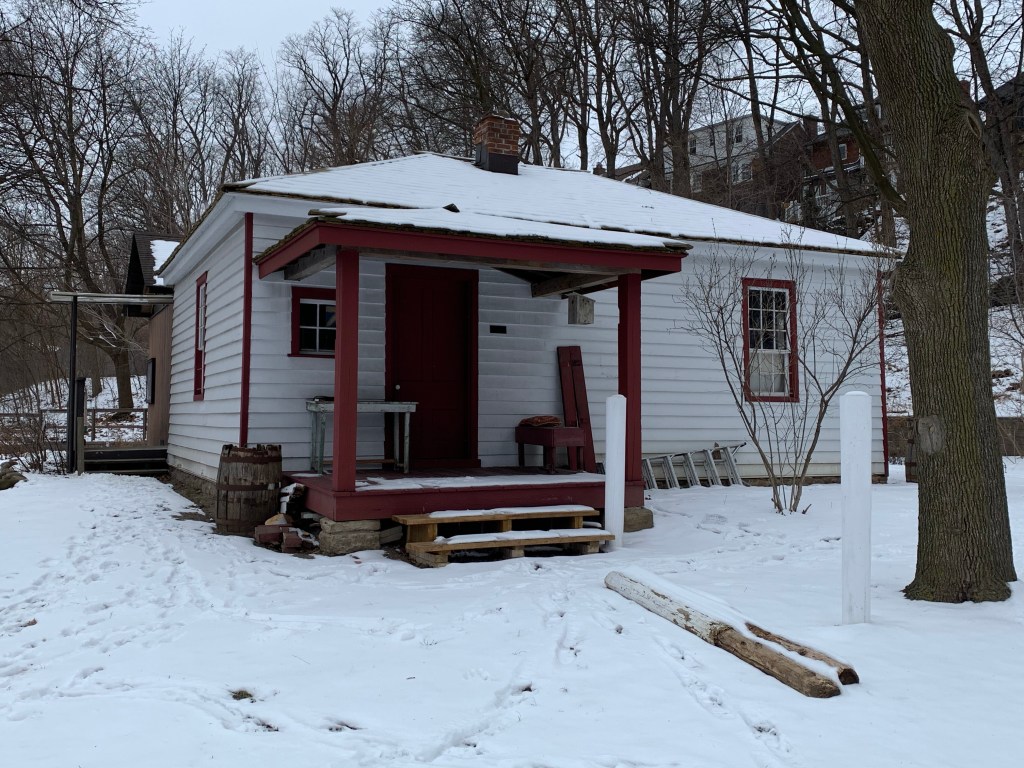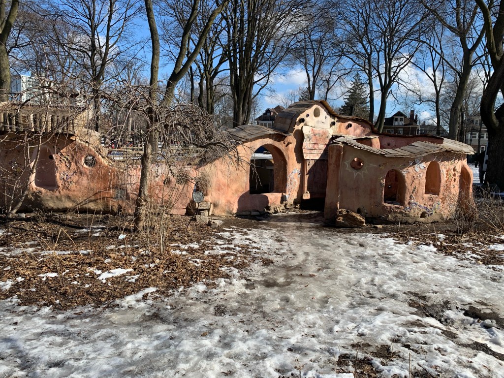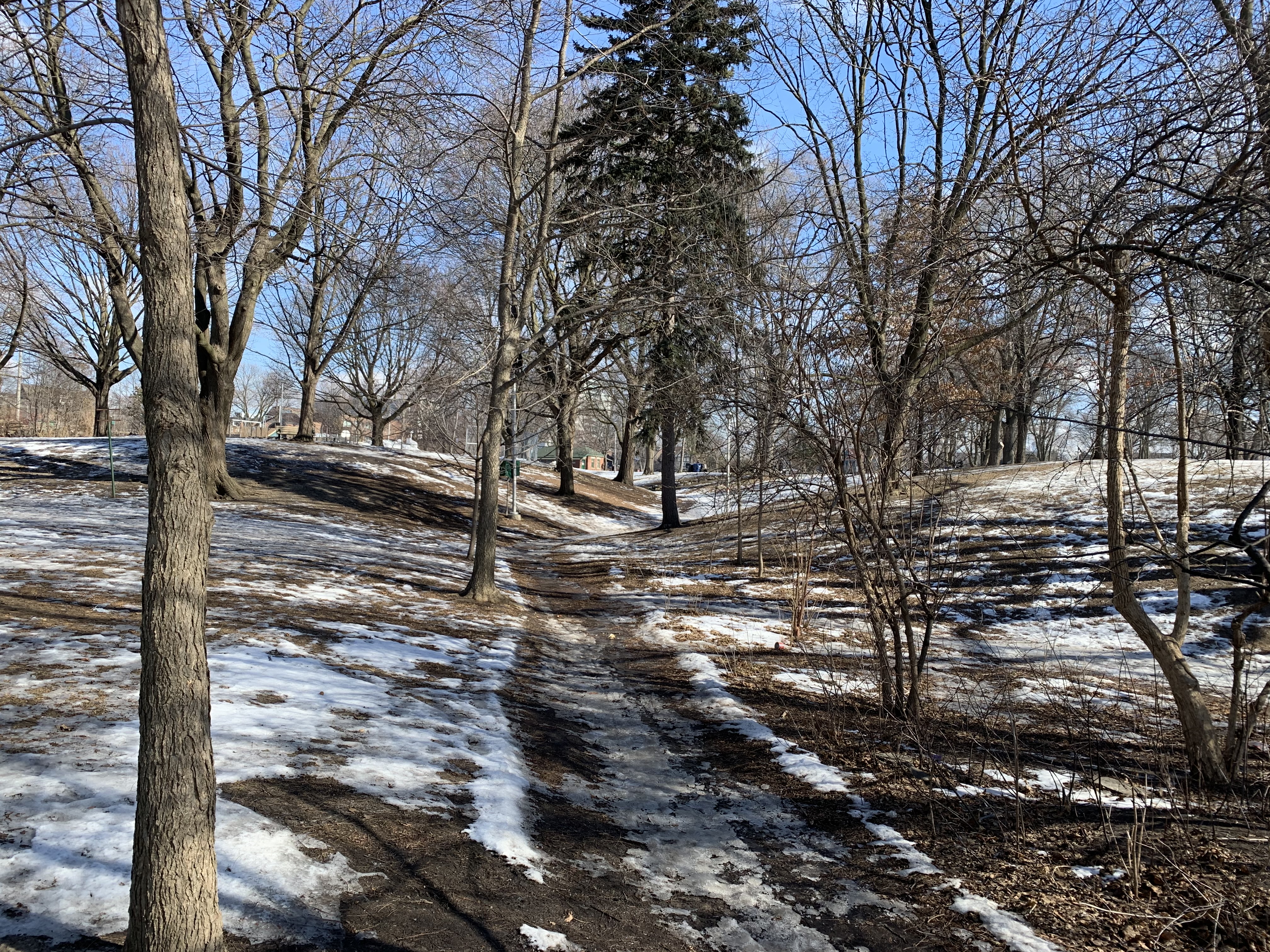 The park had a few parents with small children but for a Friday morning it was quite empty. I can imagine that Thursdays in the summer when the farmer’s market is on the park is quite busy. The snow that had fallen had been baked into ice which was tricky to walk on. In a few places there were even deep pools that people had walked over and broken through. The city was trying to pump water out of the deep one that had formed in the wading pool near the children’s playground.