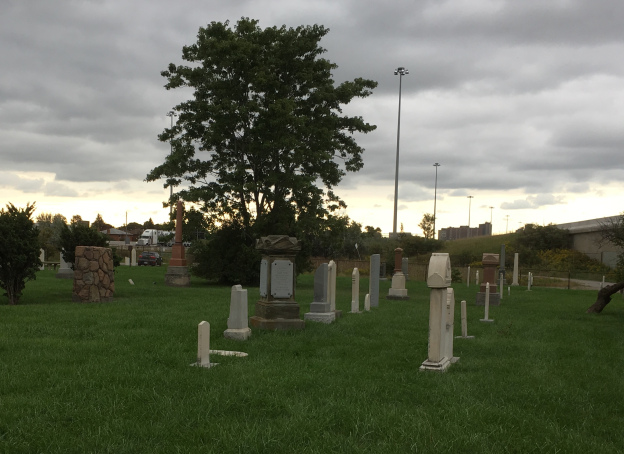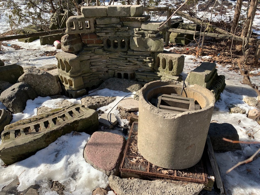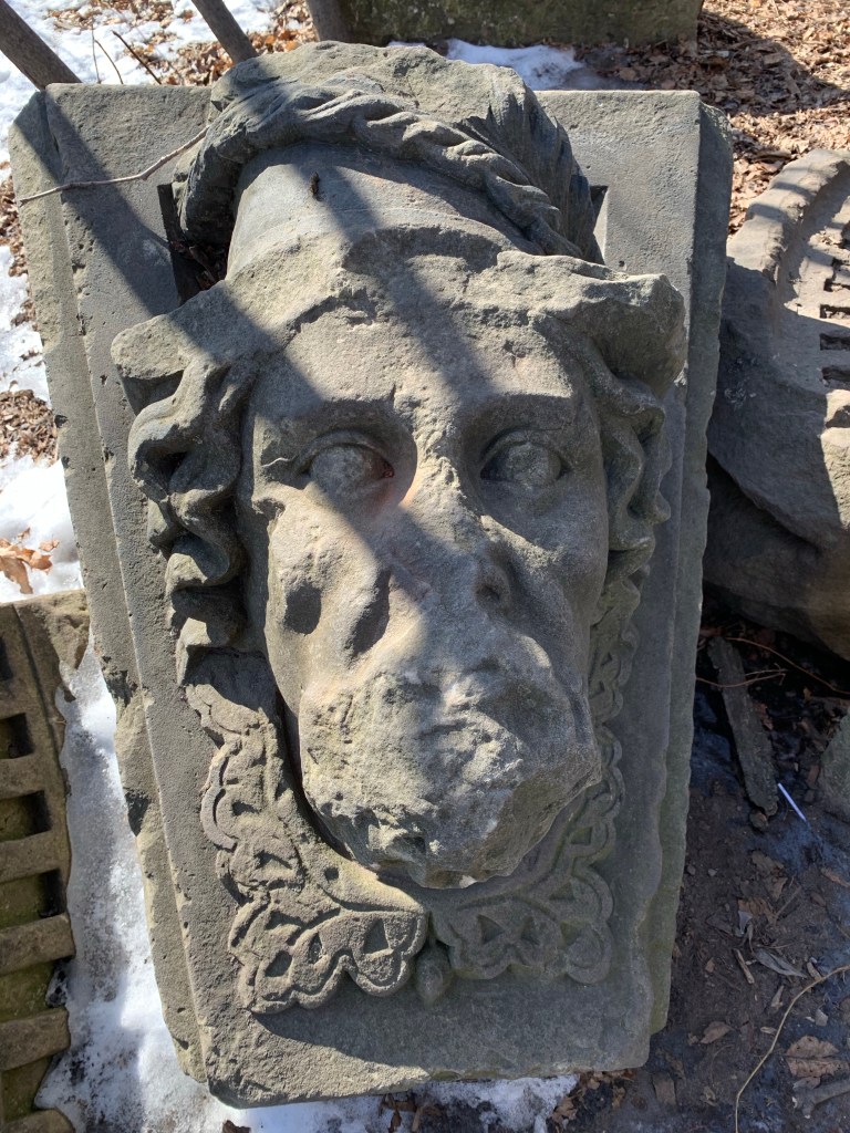 There is a second group of faces a little farther south along the side of Dufferin Street in the park. They can be found by looking for the fire pit where there is a little remembrance gardens to Garrison Creek and its tributary Dennison Creek which runs under the park. The concrete and bricks for the fire place appear to mostly be pieces of old buildings that have been brought here.