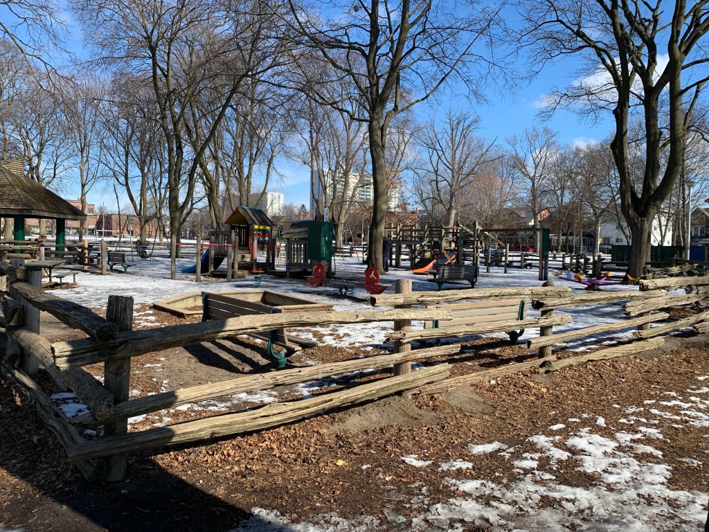 The park rises to a crest beside Dufferin Street and then is relatively flat stretching out to the soccer fields. There are plenty of mature trees even though there is no woodlot in the park. There’s even a Sakura Cherry Tree to provide some colour in the spring when the blossoms are out.