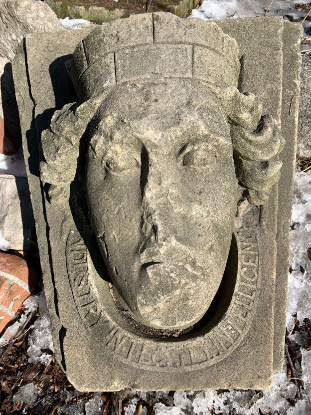 At the pit is a face of a lady with the only original (not vandals) inscription on it. The woman represents the city of Toronto and the old motto of the city of Toronto written below. “Industry, Intelligence, Integrity”.