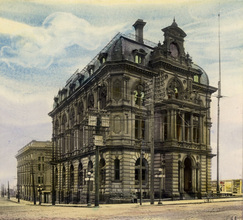 The fifth Customs House in Toronto (or York) was built in 1876 and demolished in 1919, just over 100 years ago. All of them were located at Yonge and Front Streets. The archive picture below shows the building prior to demolition you can see stone faces that were carved into the keystone in the arches over the windows.