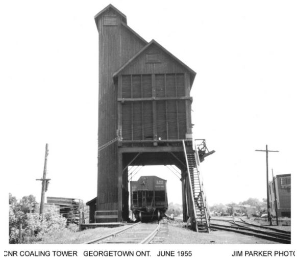 Early railways connected small communities with larger centres and allowed for the easy transfer of goods and people. Pioneer towns that had railway service often flourished while those without it ended up featured in our Ghost Towns series. For the first century of Canadian railway history, trains were powered by steam locomotives. These required two fuel sources, water and coal (or occasionally wood). Coal would be manually shoveled into the the firebox by the fireman, heating the water to boiling and creating the steam and pressure to move the huge pistons. It is said that about a pound of coal per second was required to keep a train moving at 60 miles per hour. The major stops along the railways became places to refuel with water and coal, both of which were stored in towers so they could be gravity fed into the waiting trains. All of the early coal towers were built of wood and required continual maintenance and replacement. The picture below shows the coal tower in Georgetown in 1955 and was taken from Trainweb.org.