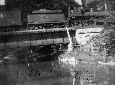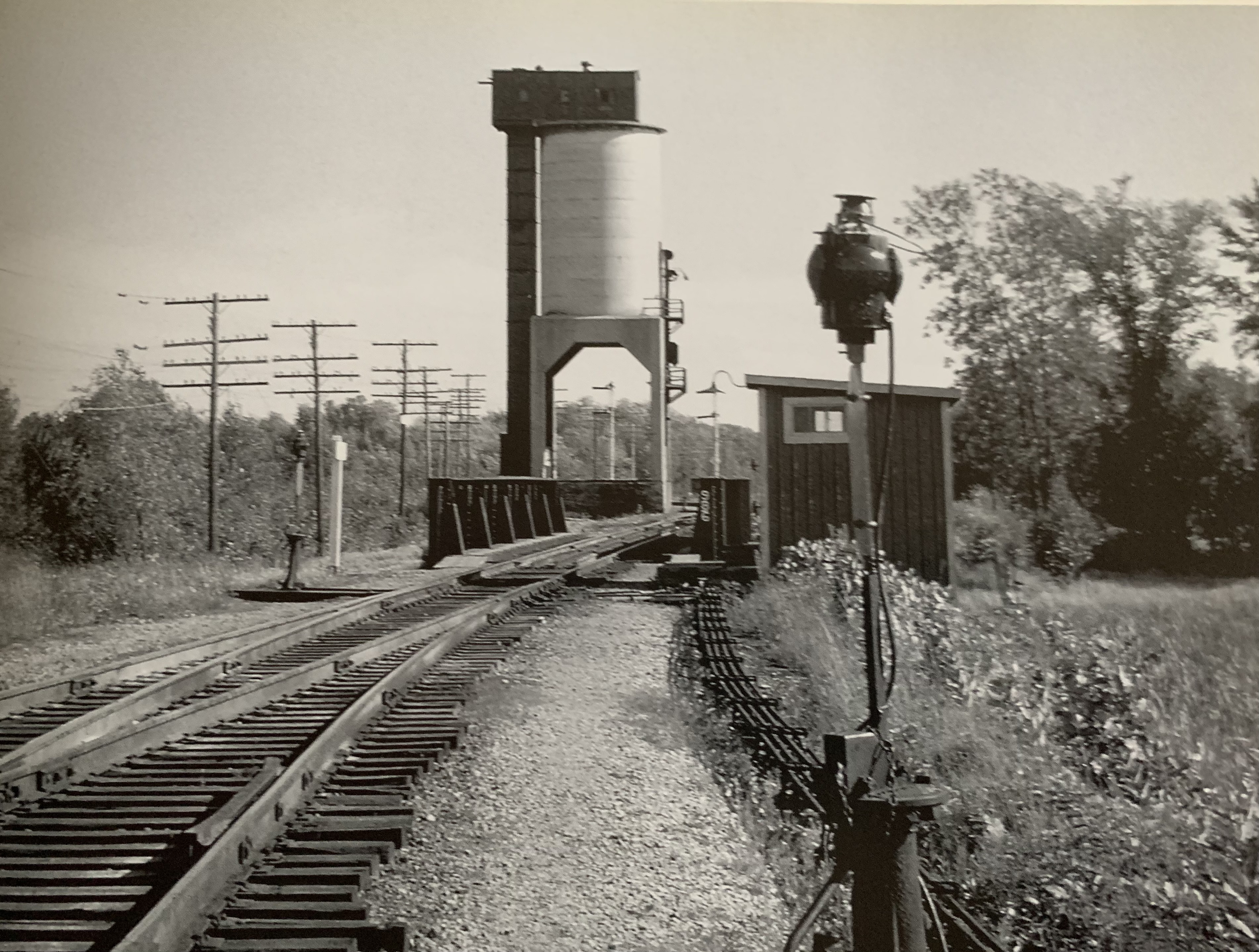 The concrete coaling tower in Washago was built in 1936 to replace an earlier wooden one. This picture from Ian Wilson’s book Steam at Allandale shows the coaling tower as it looked in the 1950’s.