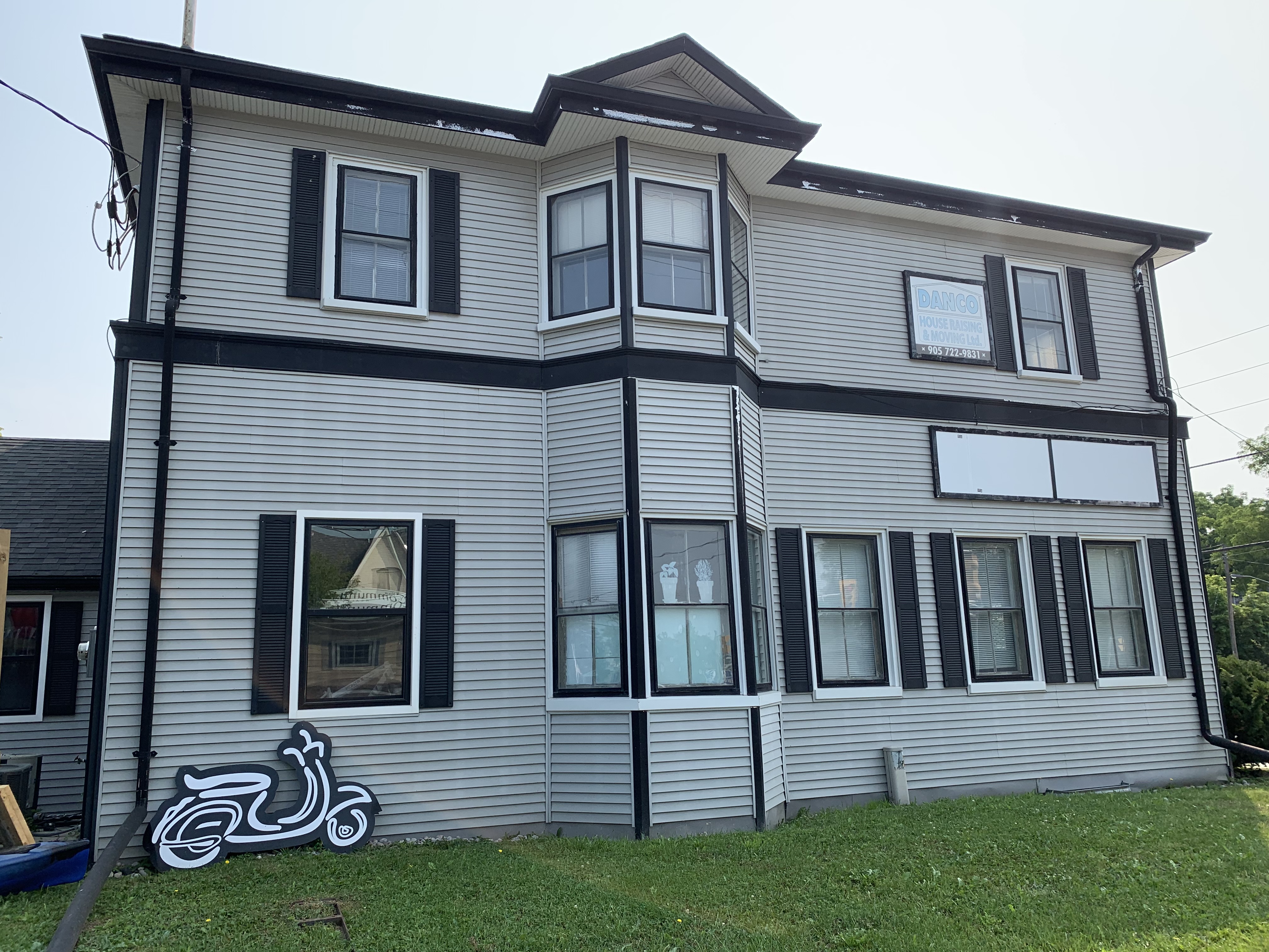 Like the hotel, the carriage house has decorative brickwork in the form of a string course above the windows, highlighted by a dentil course. The ground floor of the coach house had a place to store coaches and tackle for the night as well as stables for the horses. The second floor was used for storage of hay. Between 1892 and 1899 Dr. Alfred Asa Brown leased part of the stables for his veterinarian practice. In those days vets only really worked on horses and this was the perfect location. Starting in the 1920s a series of express and transport companies occupied the stables. Like the hotel they were also painted an ugly shade of blue, but that was stripped off in the 1980s. Today the stables are occupied by an art shop. The large entrance for carriages has been given a recessed glass doorway and the window on the left in the picture below has been extended to form a second doorway.