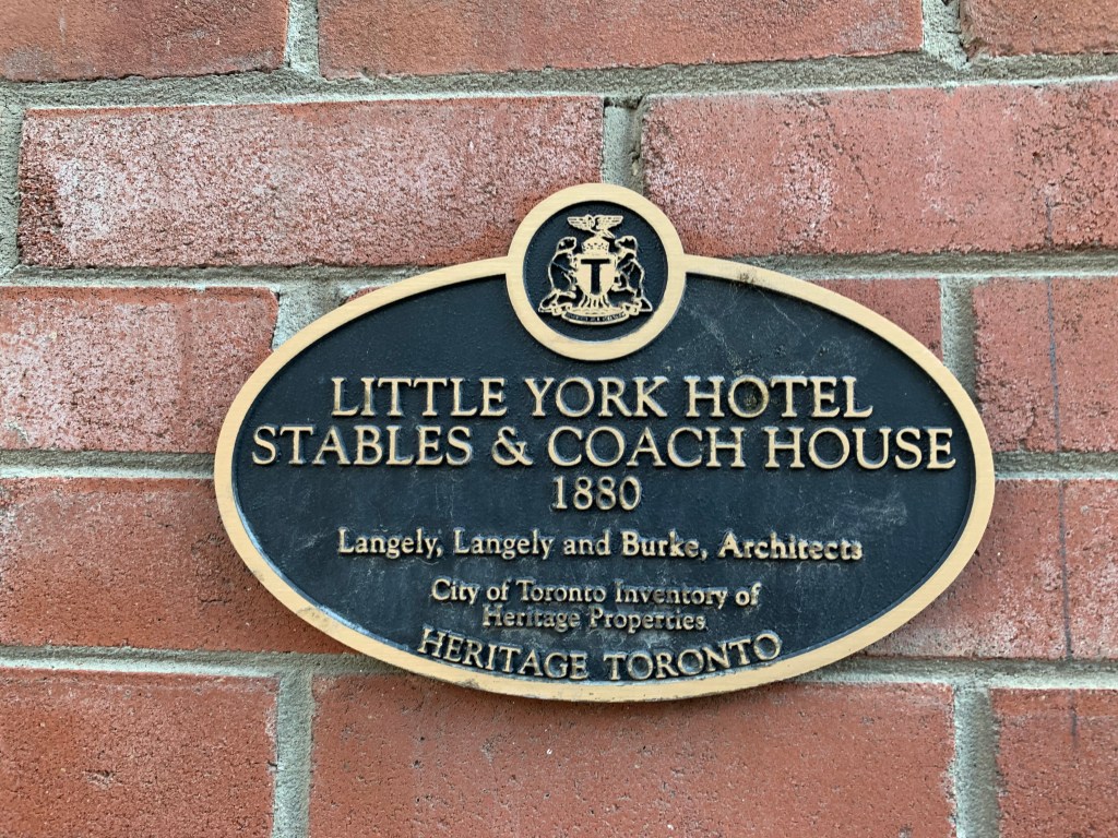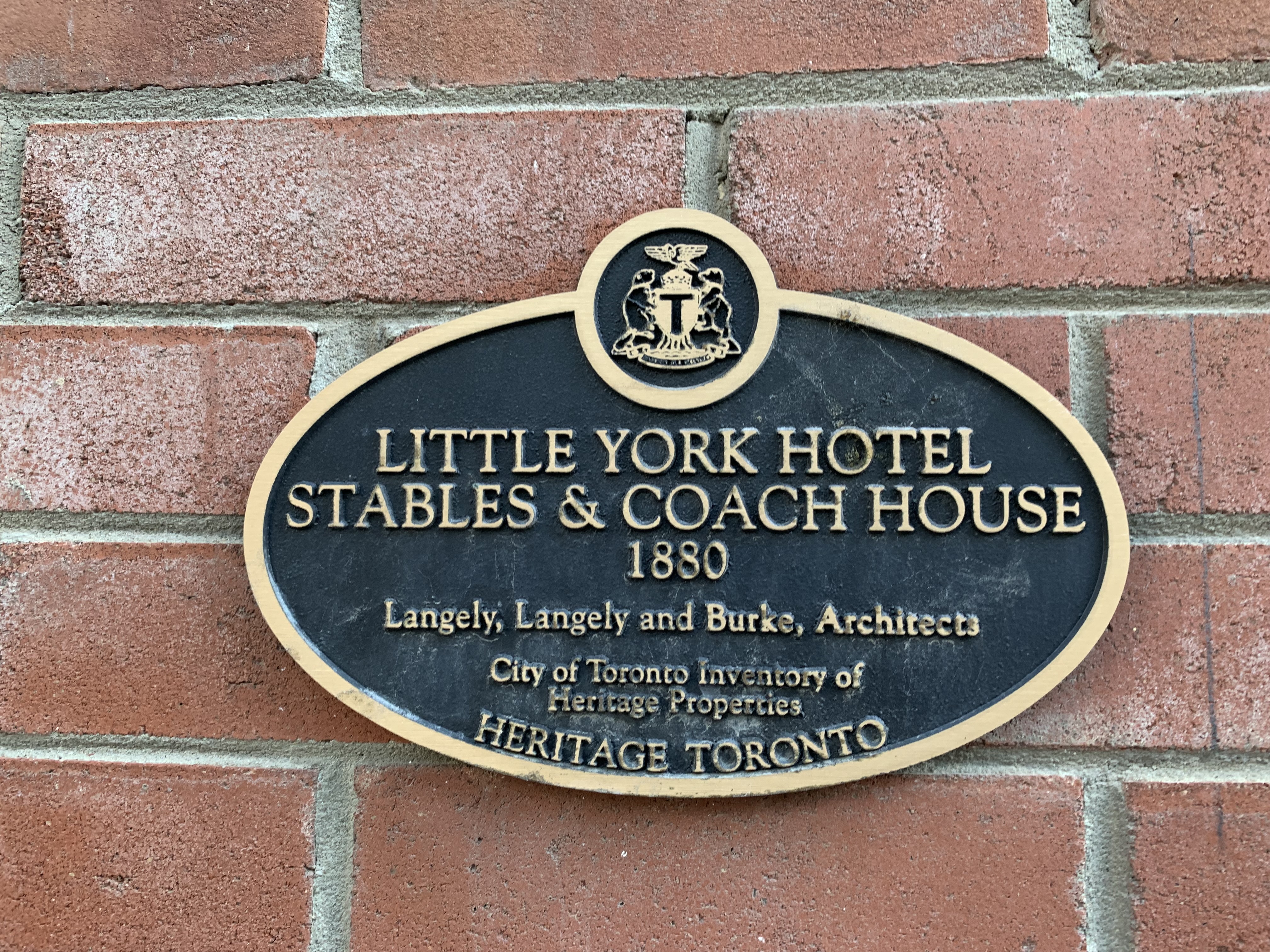 In 1973 the hotel was listed on the first Toronto Heritage Register while the stables and coach house would have to wait another eleven years to be listed. Then, on April 21, 2017 its very existence came under threat as a 17-story condo was proposed to replace the stables and coach house. To their credit, the city unanimously rejected the proposal. With the developer refusing to back down the city moved to designate the property under the Ontario Heritage Act. Designation, unlike the previous listing, allows the city to refuse demolition and limit alterations to the building. So, the developers have appealed to the Ontario Municipal Board who will pass a final judgement on the development proposal. The only question is whether or not the OMB will agree that the building merits the heritage designation. As recently as August 3, 2021 the city made its defense of the heritage designation to the OMB. That hearing was adjourned without making a judgement in this case. The building still proudly sports its 1984 heritage plaque while it waits to see if the city and the public win or if the last standing stable in the old town will give way to 16 condo units.