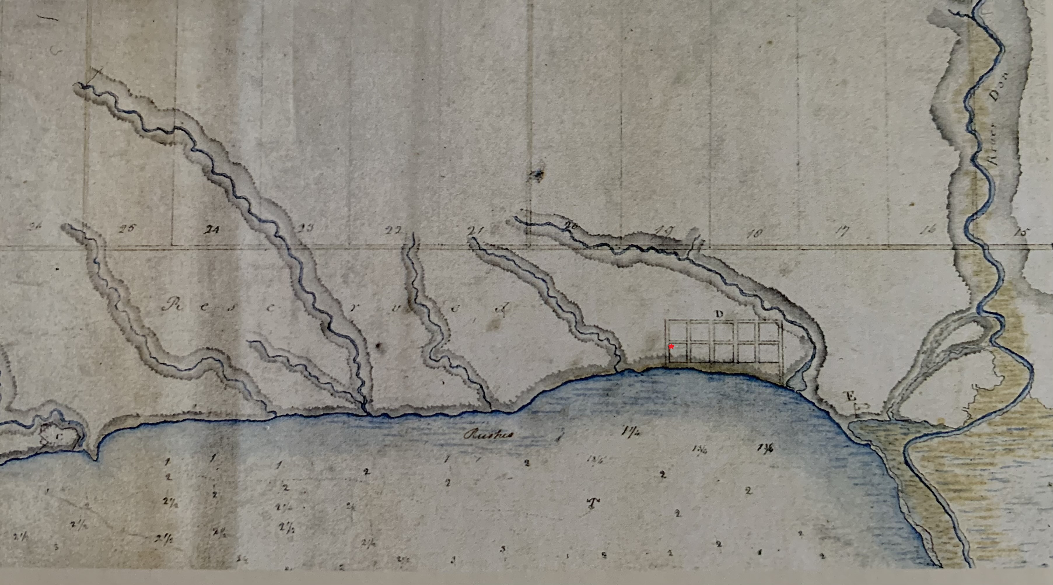 This 1793 map shows the original plan for the Town of York. The Don River is shown on the right hand side of the map and Fort York is in the lower left corner. The fort is labelled as “C” and is nestled between Garrison Creek and the lake. The town plan is shown right on the harbour, which reveals how much infilling the lake has seen over the years. The site of the Little York Hotel is shown at the South-East corner of King Street and George Street and marked with a small red star.